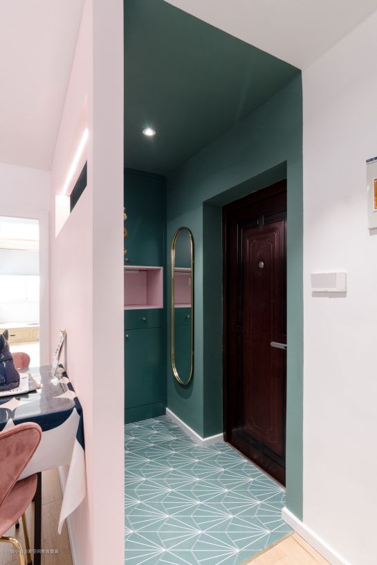 玄关莫兰迪绿墙面,粉色开放式展示区凹陷设计,一面立体金属镜,蒲公英图案地砖,整个空间很有高级感。