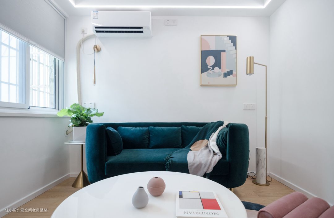 客厅白色基调,绿色绒布沙发和地毯,清新高级。顶部一圈暗灯,圈出客厅区域,很有立体感。