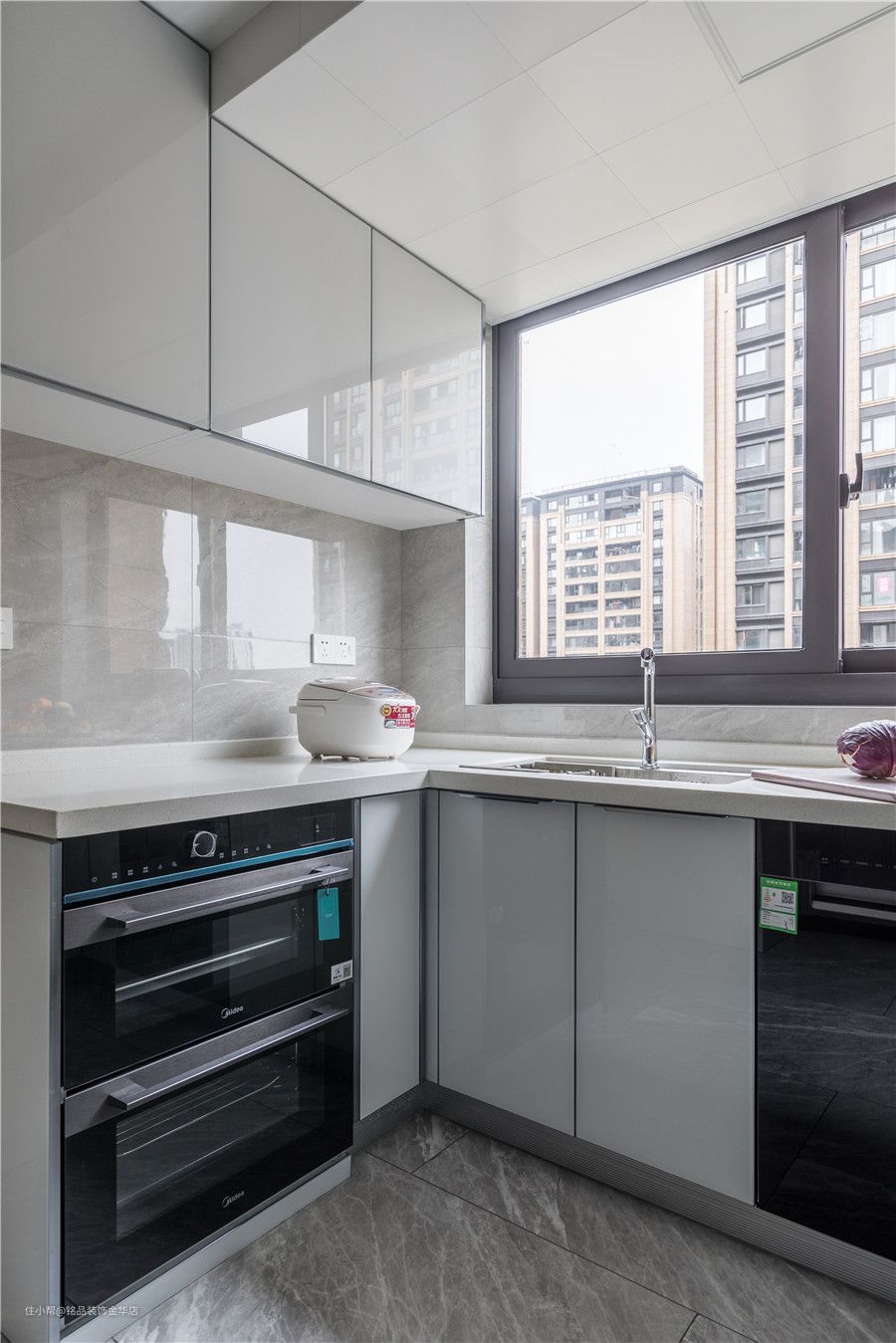U型布局的厨房让使用空间大大提升,整体按照洗-切-炒的顺序布局,洗菜池挨着窗户,可以减少台盆水份,保持干爽。