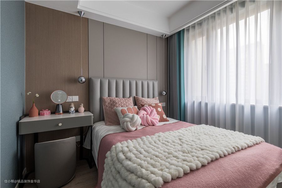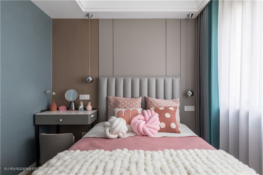 儿童房的背景墙延用次卧设计,床选择了百搭的灰色皮革,加入粉色系的抱枕与床品,甜美有度,不会过于腻。
