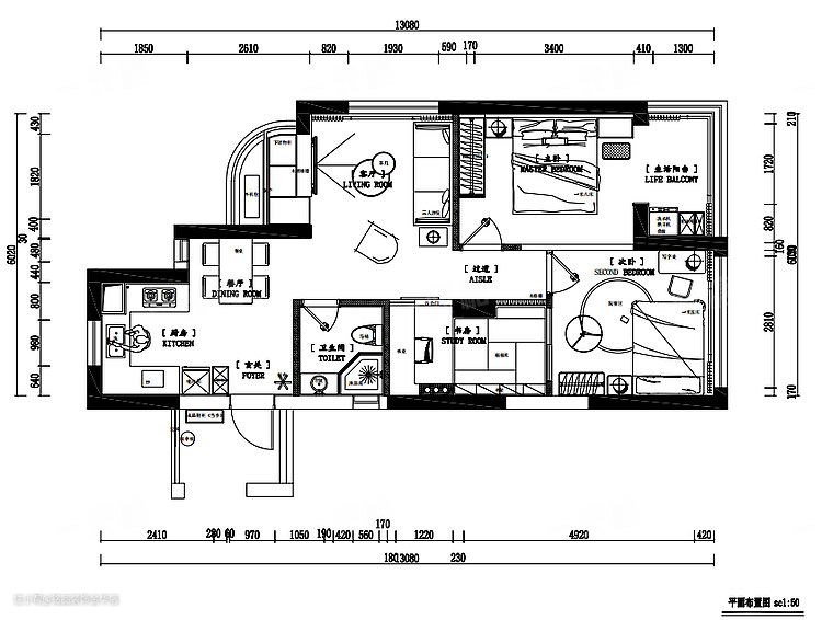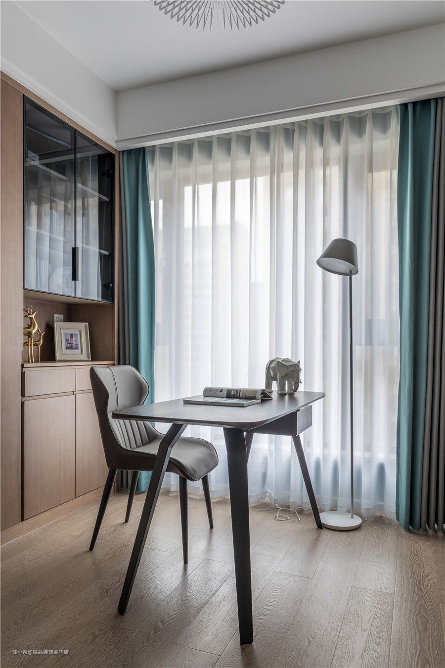 书桌+书椅+落地灯,置于中间区域,给屋主提供一个安静的学习、办公环境。