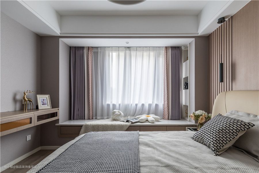 次卧是大地色系,以卡其色、浅灰色和木色为主,背景墙做了棕色和浅灰色的双拼硬包,整体低调又高级。