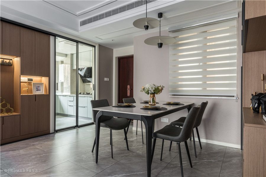 餐厅设置在入户处,利用墙面的厚度来缓解入户直视餐厅的尴尬问题,墙上的小窗有利于空间空气的流通,窗帘选择了百叶窗帘,有遮光、装饰的效果。