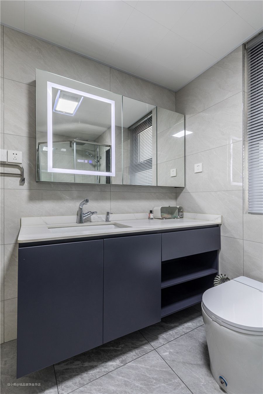 镜柜加入了智能化妆镜,台盆柜选择了时尚的深蓝色。
