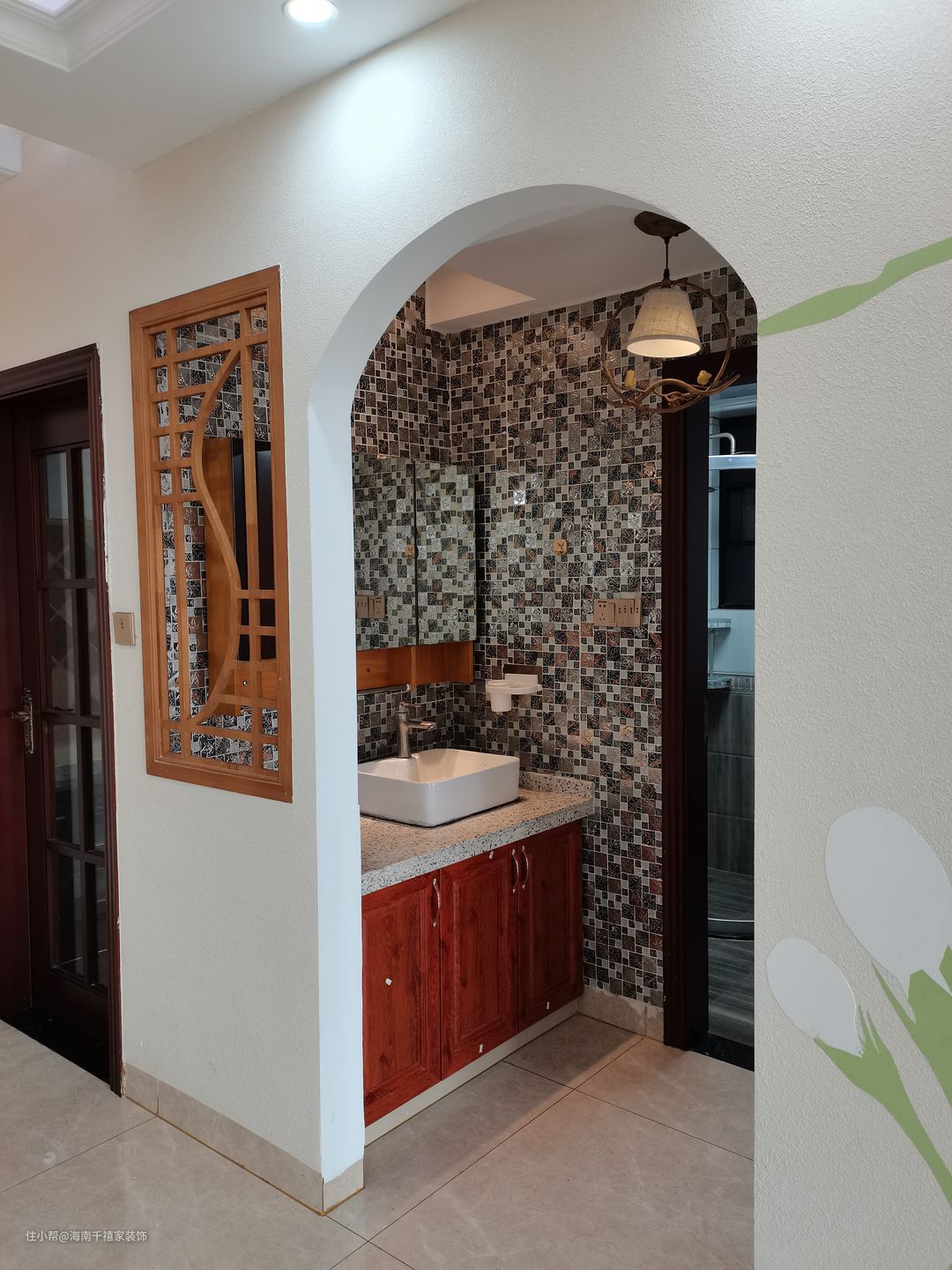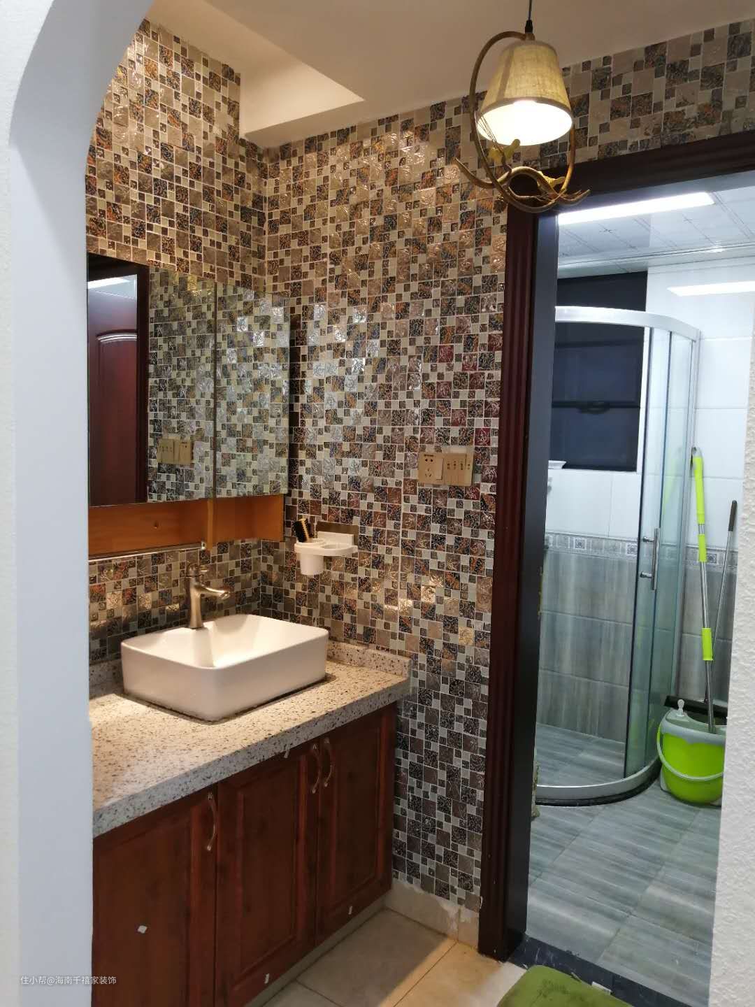 卫生间做了双分离,洗脸柜在外面,墙面贴了整面的马赛克,玻璃镜柜,定做洗脸柜(但其实吧,我们更建议做台下盆,不会有卫生死角哦)