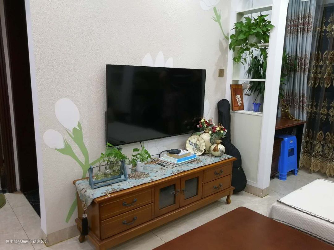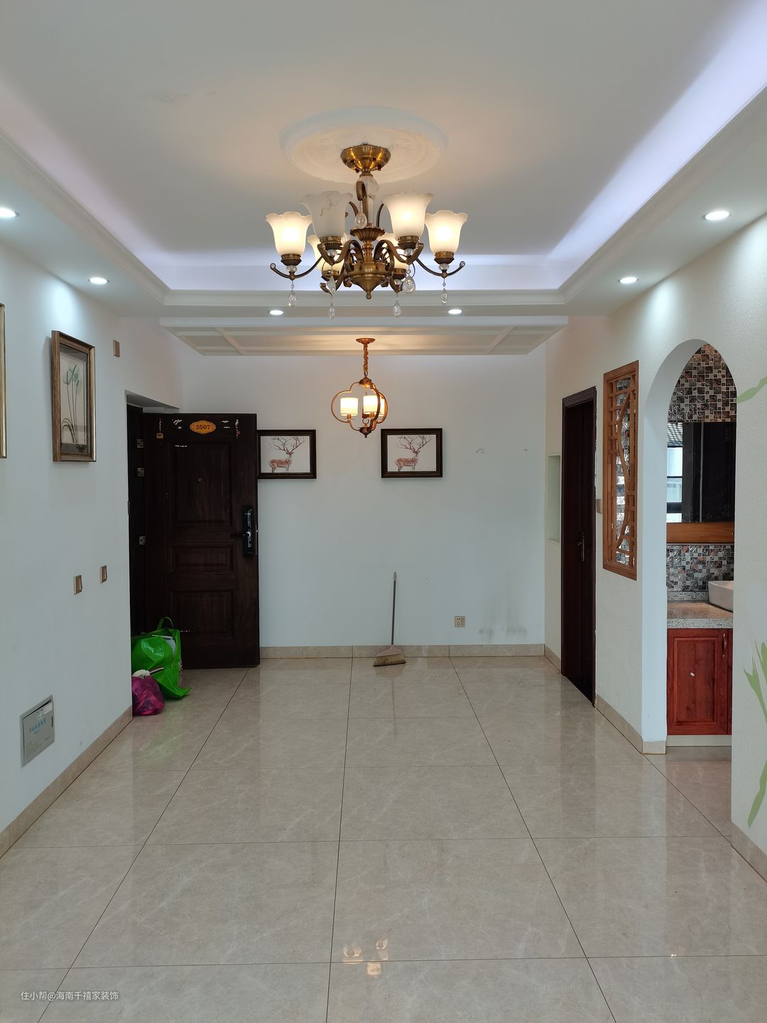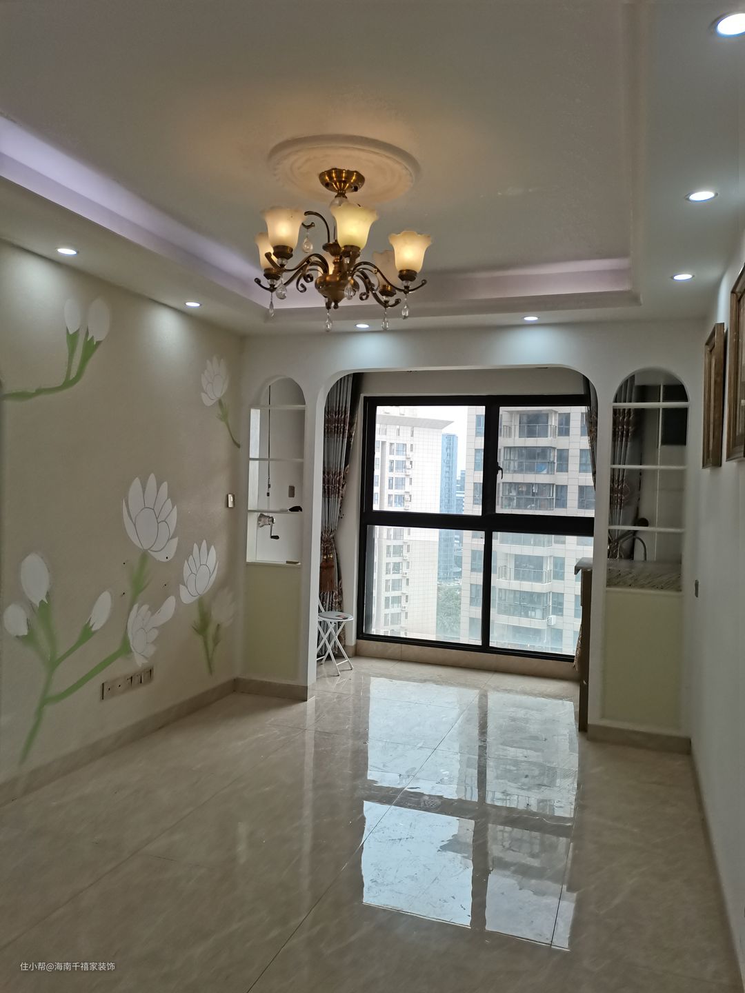 因为面积不大,所以客厅做的不复杂,背景墙一整面做了硅藻泥图案。做了灯槽吊顶,加一圈石膏线。