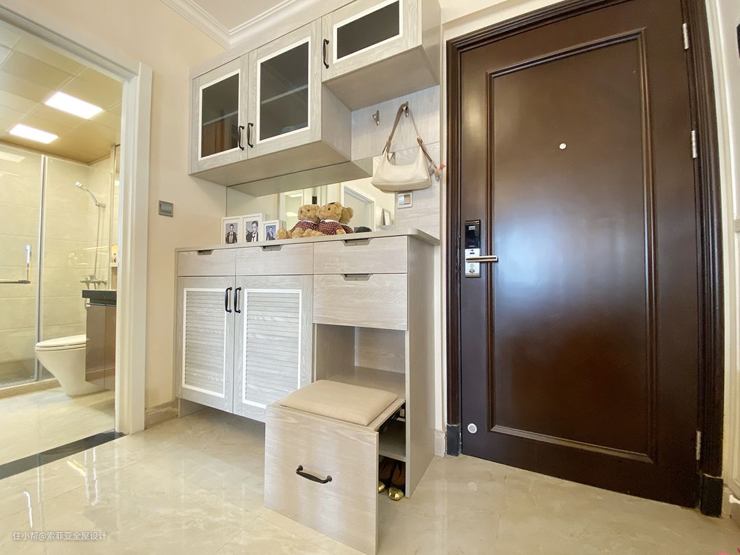 进门处定制鞋柜,高度设置在举手可达之处,顶部适当留空,不显压抑。