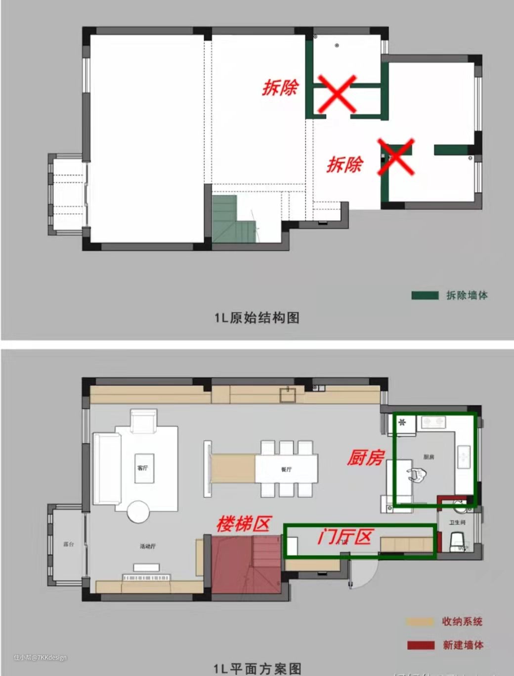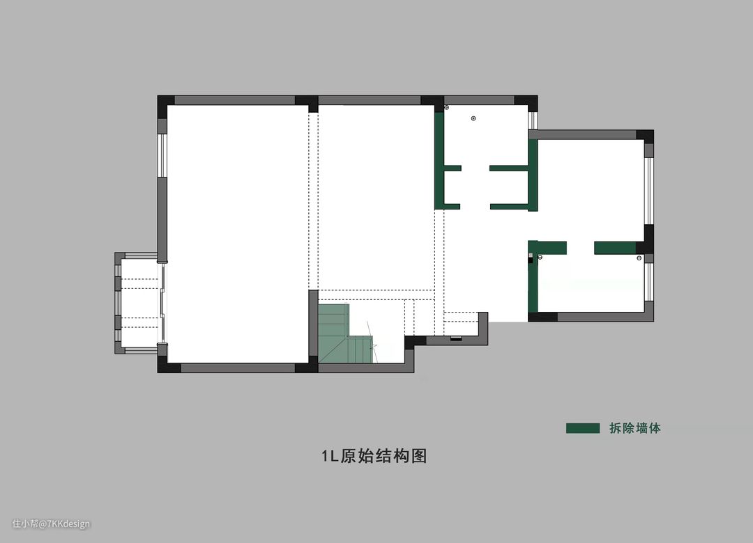 1L户型结构: 设计拆除了“标绿”墙体,将空间更大限度的拓展开。并且转换了楼梯的形式,结合玄关做隔断墙,将楼梯通道围合成一个独立的动作区。同时为了简化动线,在一层设置了拥有马桶区的卫生间(约1.5㎡)。(原本的厨房区域)