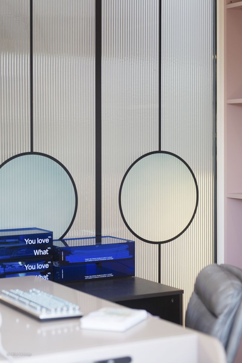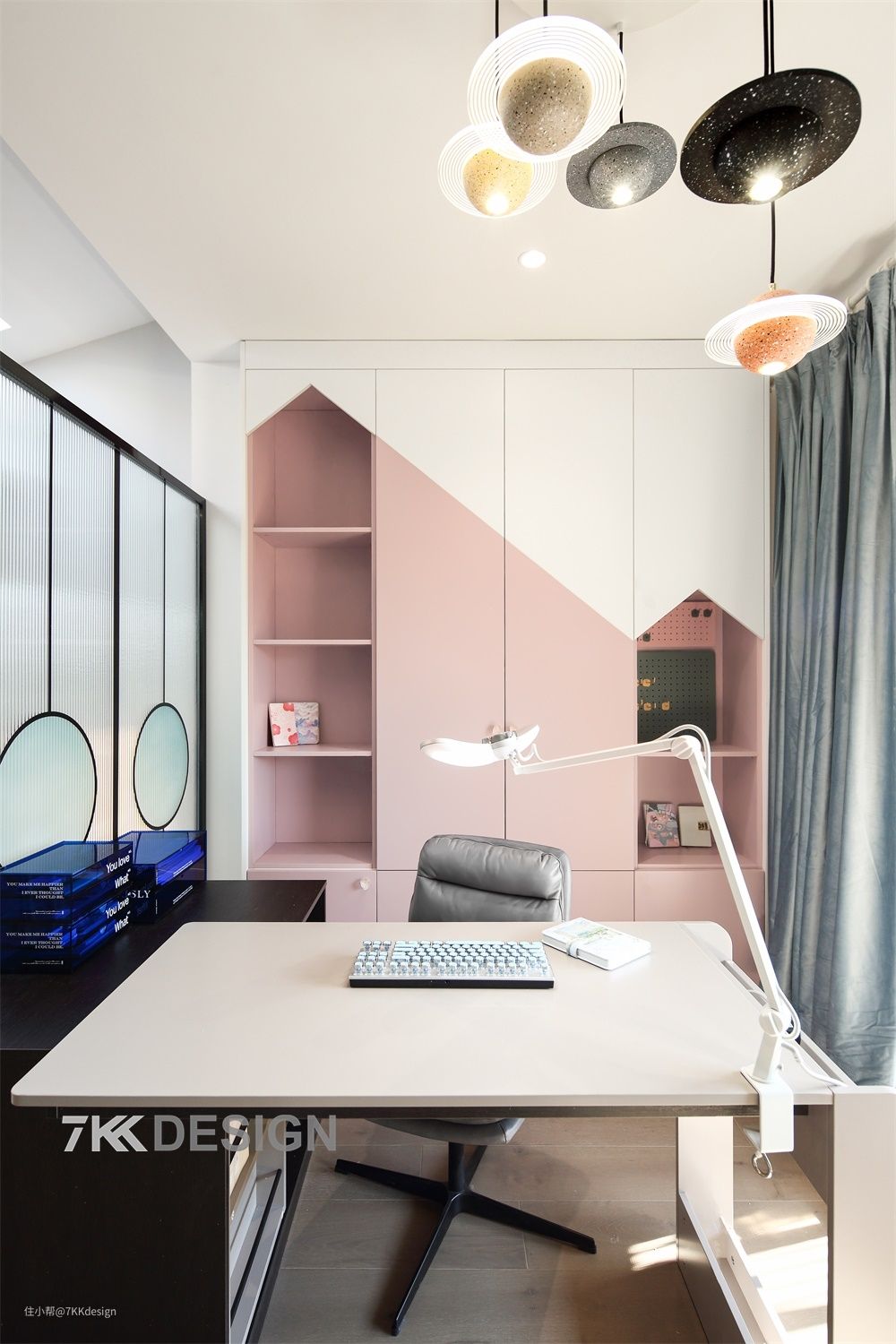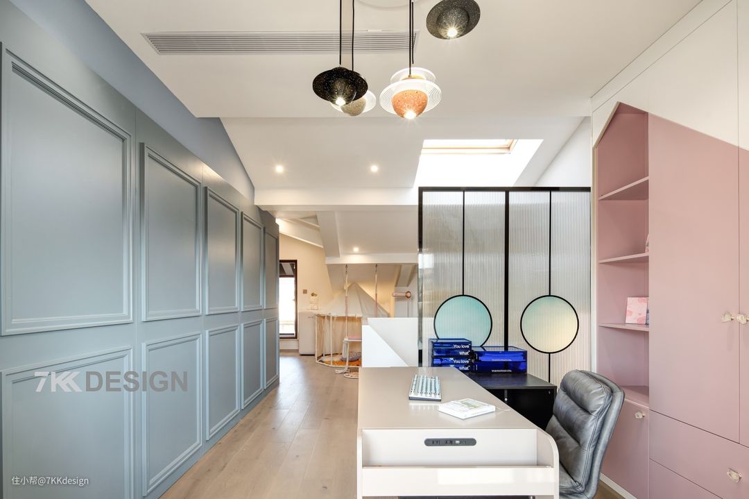 阁楼是孩子的专属天地,少女粉和晴空蓝的配色,童趣十足的UFO吊灯,支个小帐篷,学习与玩耍都不耽误的别样世界。 结合安全性和采光、通透性,及拉高视觉等因素,我们在楼梯一侧用没有到顶黑框长虹玻璃作为隔断,起到遮挡保护及透光的作用。