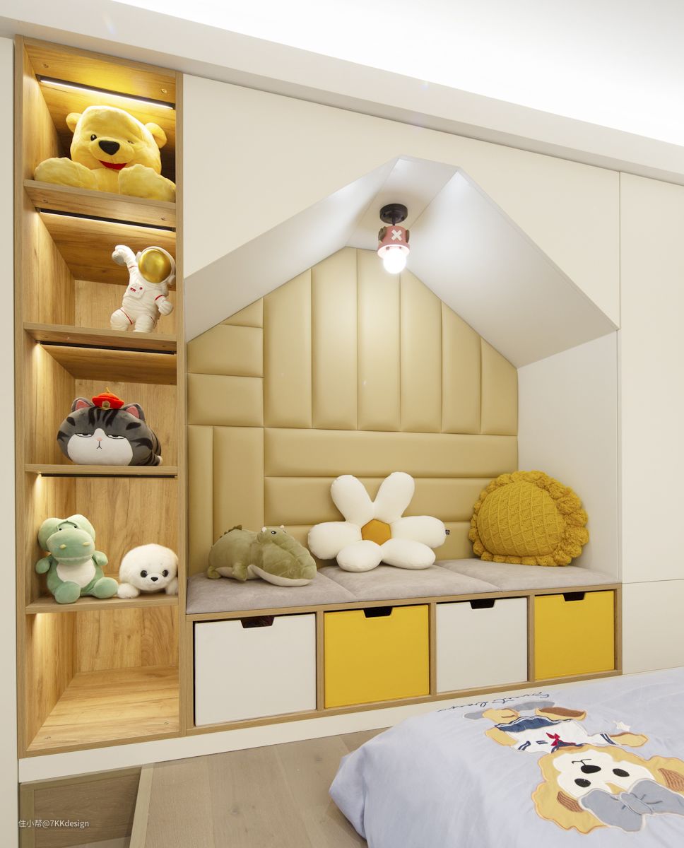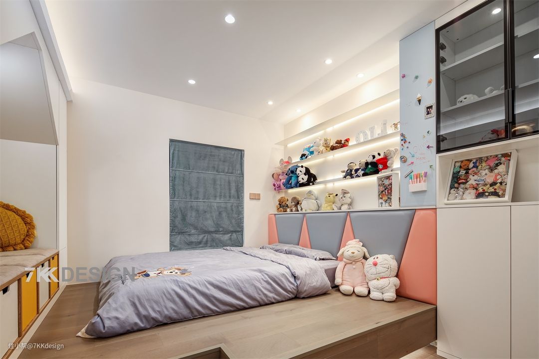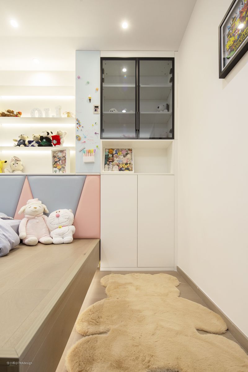 给小孩一个属于自己的空间加上趣味性的设计,有利于培养孩子的动手能力和独立性。层板和黑框清玻璃柜子之间的墙面利用也没有放过,做成一块小黑板墙,随时随地可以发挥想象力去创作。 床尾墙面是烤漆板的衣柜+卡座+原木色开放架的形式,打造一个温馨舒适的阅读角,用童心点亮空。