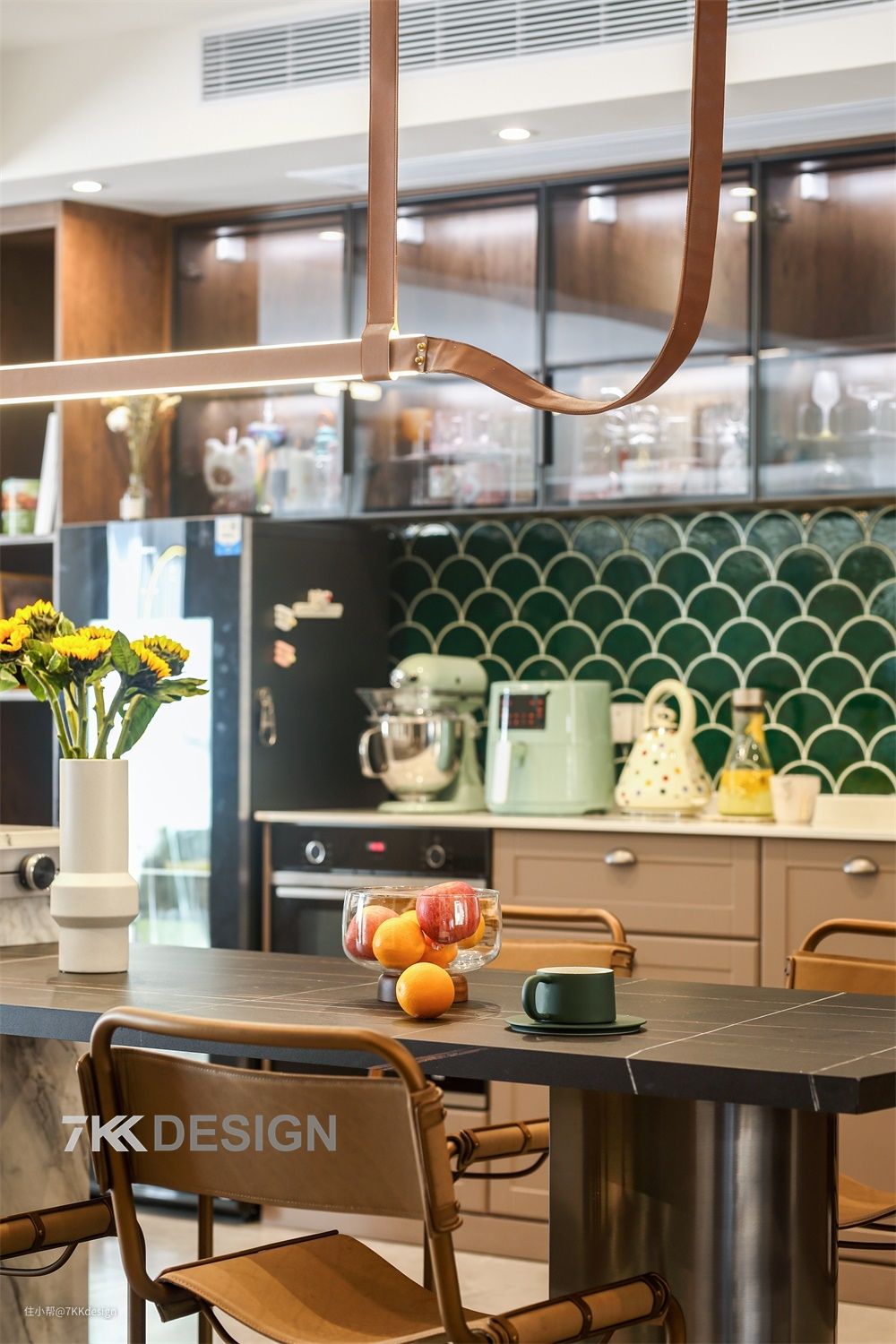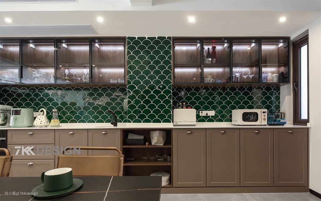 ✅一字型西厨:横向一排吊柜,也是酒柜,半开放式设计,具备收纳功能也作为展示装饰空间。 吊柜的柜门是做的上掀式玻璃柜门,半开放式的设计,平时用来好看的杯具、餐具、酒类等物品,还能作为展示修饰空间,一目了然,拿起来也方便,省去了翻找的功夫。 中部做超长操作台,下方做地柜,收纳力MAX,东西再多都不怕。 左侧客厅和餐厅的小隔断部分,做成了开方式的格子柜(宽400mm),用来收纳书籍,及一些有意思的摆件。地柜整体是选择了开放式+封闭式结合的形式来做的,墙面贴的绿色鱼鳞砖,与玄关的平衡呼应,让空间更加协调。