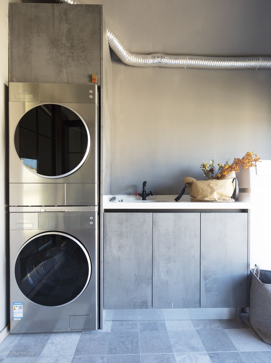 选择黑色不锈钢的踢脚线,与墙面黑色挂钩相呼应,对空间进行点缀。整个柜体采用无拉手的按压式设计,看上去整洁统一,极度舒适。地面从楼梯位置到卫生间这个区域铺的都是小方砖240*240mm,白色美缝,耐脏又起的很好的过渡作用。