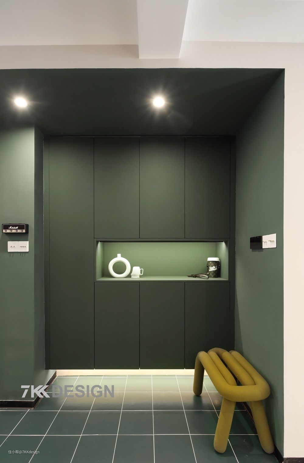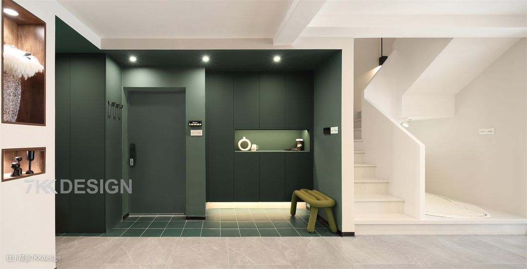 这样进门结合两侧也很好的形成了一个门厅区,一侧做顶天立地柜,另一侧的凹区部分,做成的悬空柜(高度在2m左右),中部留空,随手拿放包包、快递等物品,底部留空藏光,方便放置日常进出门的常用鞋类(一脚踢),搭配一个可移动的换鞋凳使用。 整个区域利用一片复古绿,与极简的白色楼梯,形成强烈的反差,通过色彩分区导视,区域的功能性一目了然。女主比较喜欢绿,自然清新有生机,给人视觉感受舒适又积极。玄关作为家的第一印象,当然要随心,因此,墙面、柜体以及地面选择同色系的复古绿色,吸睛又养眼。