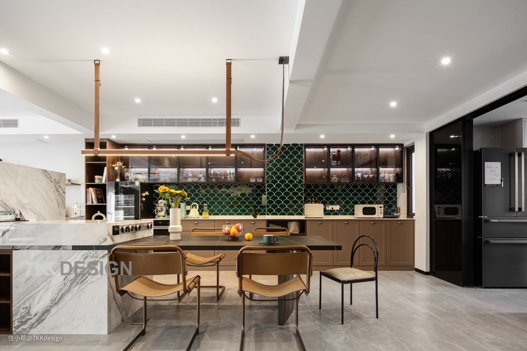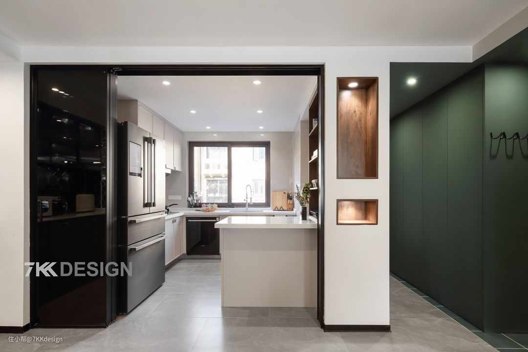 ✅中厨双门设计:传统的侧厨布局,封闭空间,不适合家庭成员间的交流,缺少了社交属性。并且也不符合男女主的需求。于是,我们将侧厨的两边的打破,改成一侧吊轨三联动折叠门,与另一侧的开门相互作用,就不用担心油烟外泄问题了。关上门,形成封闭式的空间。打开推拉门,中西双厨、餐厅、客厅、玄关融为一体,最大限制的撬开了空间尺度,打破常规,放大空间的同时还能深化家人之间的互动以及交流。