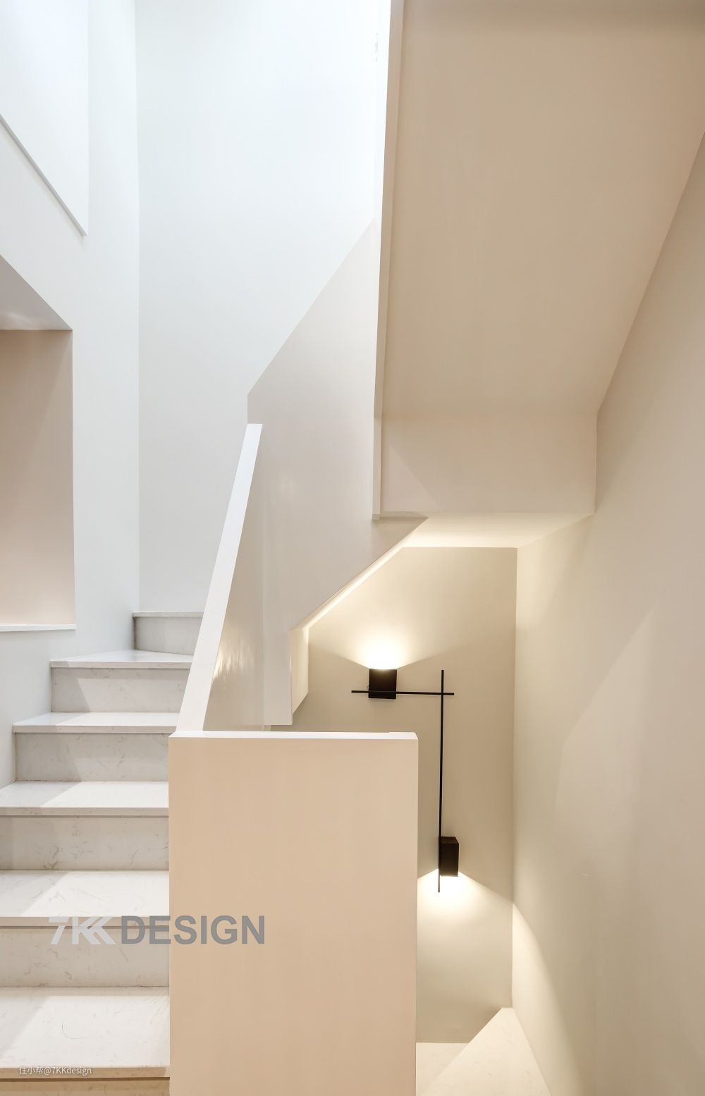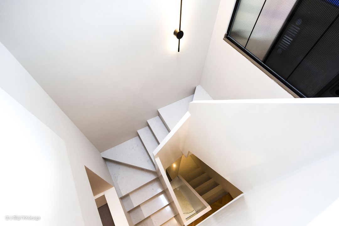 白色楼梯设计,线条的交错,动线分明;色彩的纯粹感,视觉上清爽舒适;悬挂黑色的线条构造壁灯,为走道照明的同时,又点缀了空间。大理石踏步,扶手是木质的上的白色漆面。