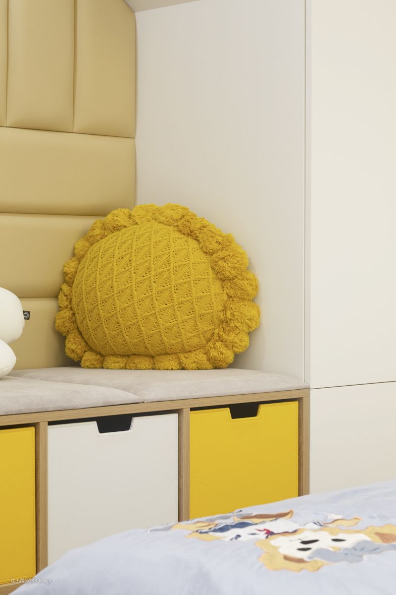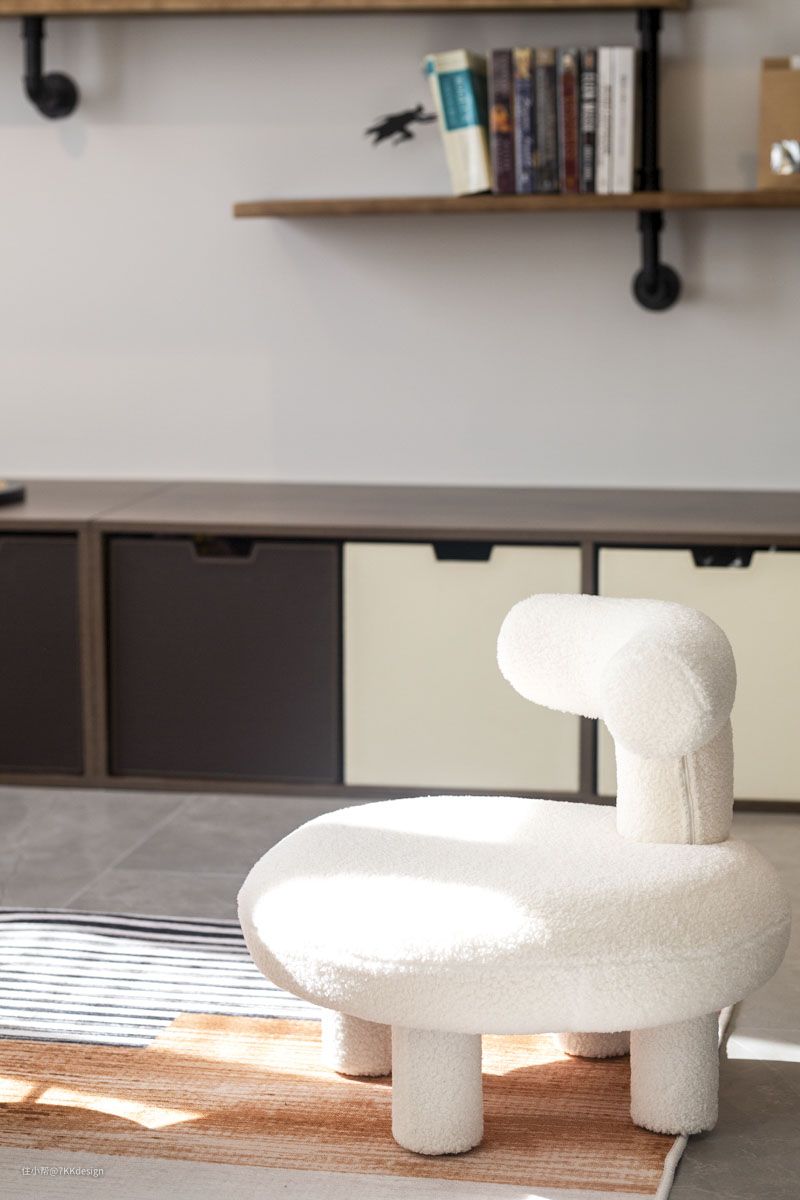 沙发区,女主人在网上淘了一个可拆洗的羊羔绒儿童沙发凳,羊羔照射进来的时候,看起来软绵又舒适。侧边还配了一把沙发躺椅,沙发区,可坐可躺,怎么舒适怎么来。 沿着墙面的的空间,设置了开放架及地柜,上面可以展示游玩搜罗的纪念品,下方可储物,收纳零食杂物等。