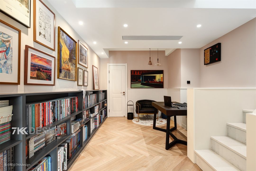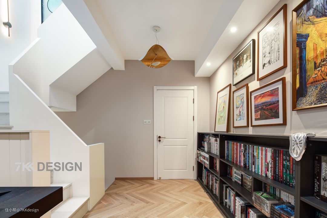 一楼的楼梯上来,就进入书房空间,也是办公区,靠墙做了一排地柜,收纳get,摆放了满满的书籍,给足了空间满满的文化及阅读氛围。