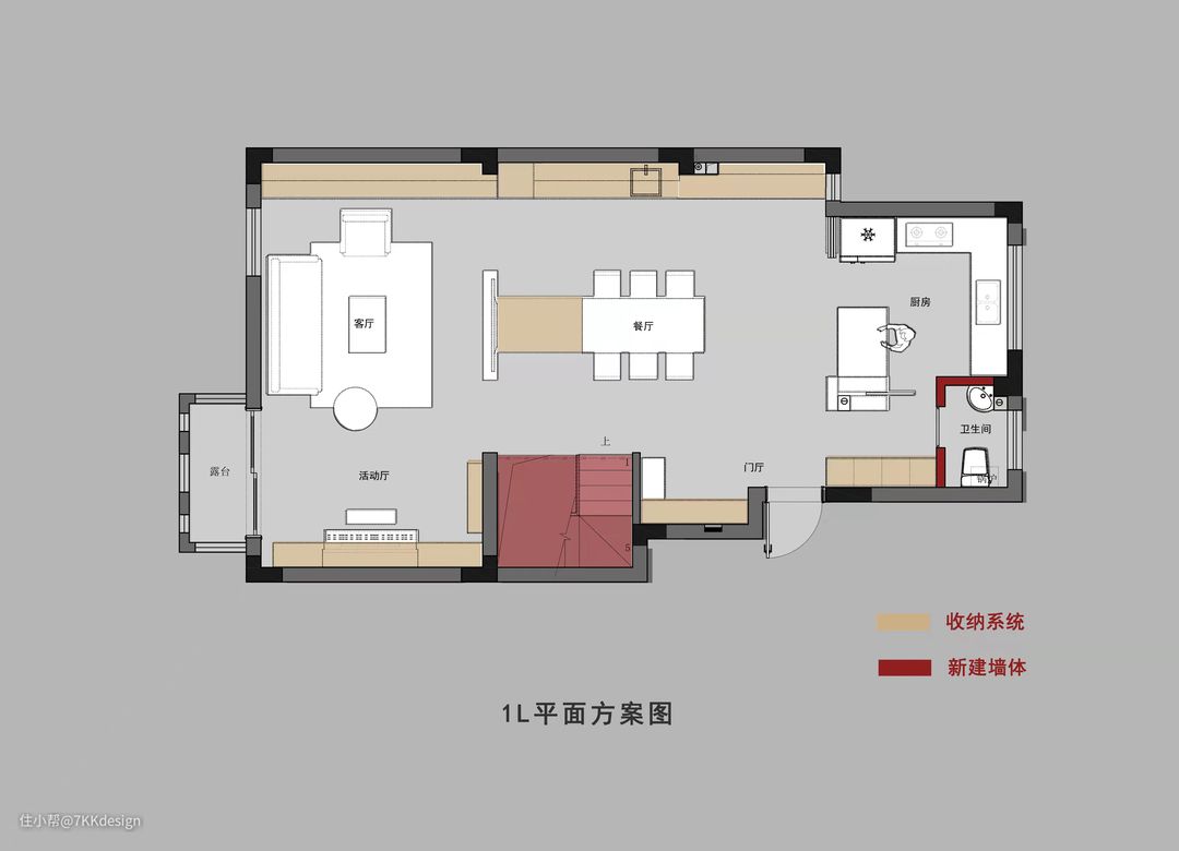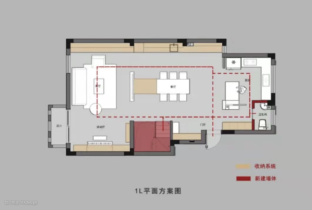 1L平面方案: 将一层整个空间规划为动区使用,容纳了客餐厨三大功能区,采用LDK、洄游动线、中西双厨、餐桌岛台一体化等细节设计,来进行合理布局,不仅使空间通透显大,同时拥有超强的收纳系统,而且还特别适合一大群人的party,为聚会提供浓烈的氛围感。