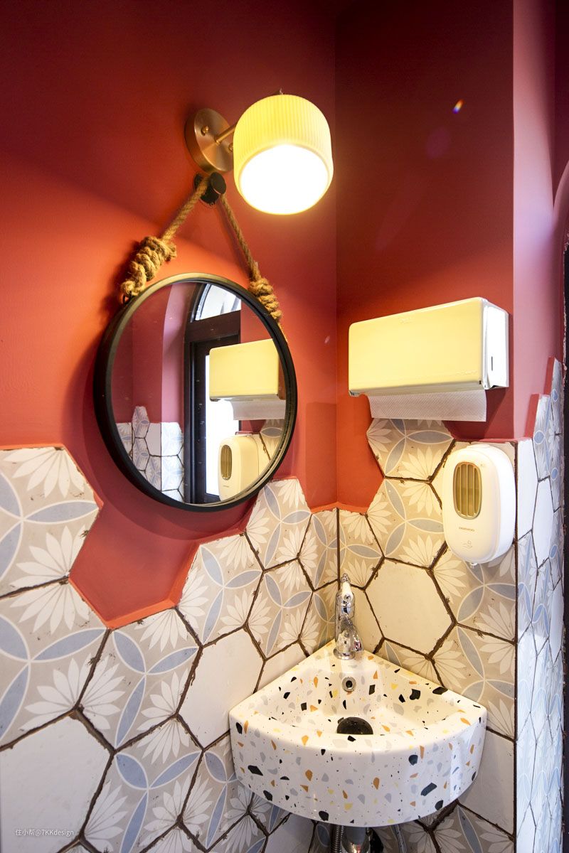 通过玄关厨房间的夹道进来,就是这个卫生间了,考虑在一楼活动,想要解决需求,还要楼上楼下跑,会很不方便,特别是又亲友来访时,在一楼安排上卫生间,可以有效断开楼上私人空间和楼下公共空间的关联,保留一定的隐私性。 面积比较小,只有差不多1.5㎡,都没有角度可以拍的全面。因为不需要洗浴功能,所以只安排了马桶和洗手池。墙面采用的拼接手法,六边形的花砖和红色防水乳胶漆,搭配壁灯和草绳吊镜,三角台盆,有种复古年代感,特别有feel~
