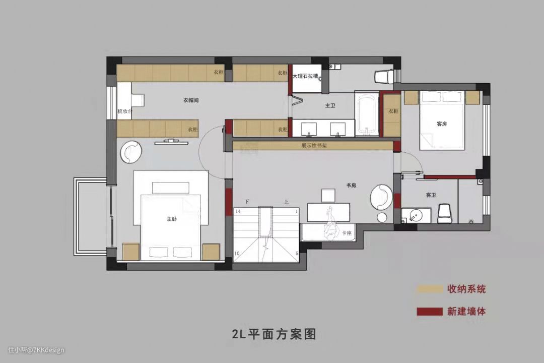 2L平面方案: 设计对“暗房”的隔墙进行拆除,与走廊空间形成一体,让整个空间视野更加宽阔,也能够纳入更多的自然光。将其设置成为一个带有办公阅读功能与休闲一体的家庭式公共区域,同时为了保证充足的采光且合理利用空间,在走道的一侧安排上长达3m的地柜,作为开放式收纳使用。 原本次卧与卫浴间的隔墙是320mm,过于厚重,我们把它拆掉重新建立了一道120mm的细墙,从墙体中多压榨出一些给到卧室空间。结合屋主的需求,我们把二层空间规划打造为整个静区,具备一定的私密性。将多余的门洞封起来,形成一个超大的套房式主卧空间,且把内部的隔墙拆除,重新分配衣帽间和卫生间的使用面积。 主卧的开门位置,因为侧边并没有墙体支撑,因此设计成了180°大开,这样对动线上不会造成影响。考虑到屋主对衣物收纳有强大的需求,因此卧室的与衣帽间的隔断都充分纳入了收纳系统,在过道的两侧也做成大量的柜体,结合窗前梳妆台的布局,来满足主人的生活需求。 卫生间采用双台盆+四分离设计,浴缸和淋雨的结合,让生活体验感舒适性更高。