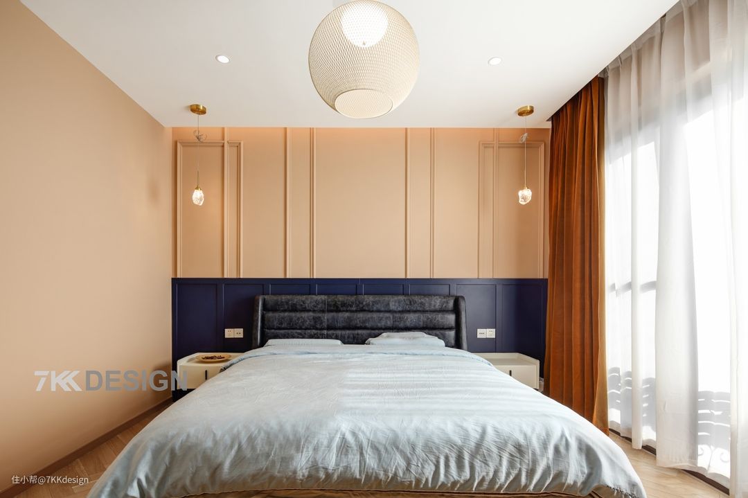 床头背景墙本来设计是用的浅咖色,后面选的暖咖色与宝蓝色拼接,效果也不错,温柔与沉静的结合,墙面用石膏线条做造型,性价比高,又不失质感。