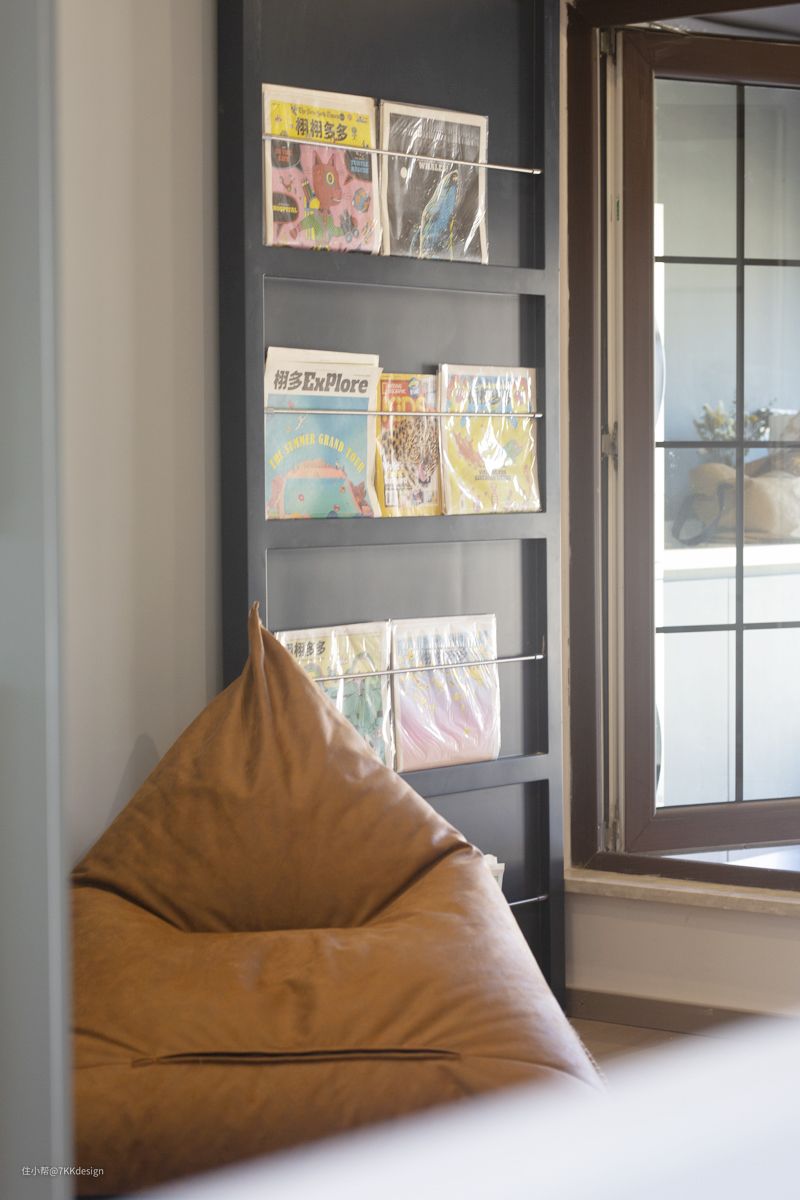 懒人沙发旁黑色的杂志收纳背景,后面藏着一间储物间,关上门就“隐身”,完全发现不了。