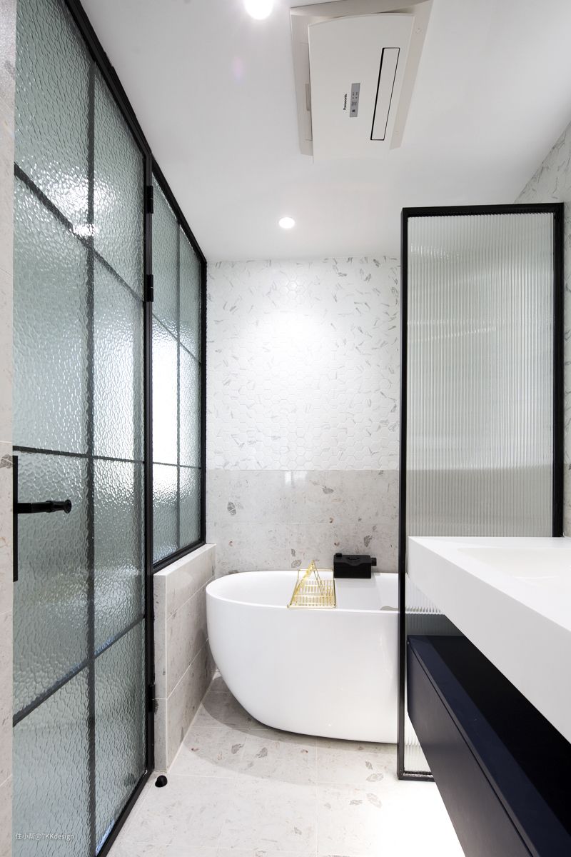 主卧卫生间分配了近8㎡,四分离设计,每个区域保持在一个舒适活动的范围。设置双台盆,长2m的洗漱台面,男女主的洗漱用品可以很好分别摆放,浴室柜悬空,底部留空无卫生死角,方面清理。中间夹层可以放置浴巾等洗浴用品。抽屉也具备强大的收纳功能,囤放了沐浴洗漱纸巾类。马桶区、洗漱区、淋浴区采用窄边黑框磨砂玻璃门作为隔断,通透不透视,相互之间独可立使用,浴缸区则做的半隔断,弱化小空间感的压迫感,营造泡澡的舒适氛围。