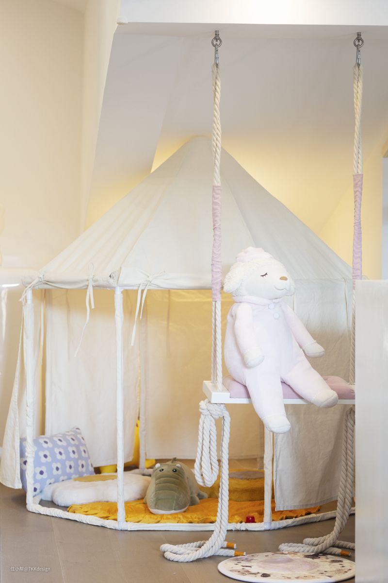 整个顶面层高参差不一,为了避免压抑感,没有做复杂的吊顶,而是通过刷白藏梁,来弱化。这个位置是阁楼层高较低的区域,布置了一个小帐篷及悬挂秋千,在一边还有画架,给小孩一种不出门就能够体验到户外写生的感觉。
