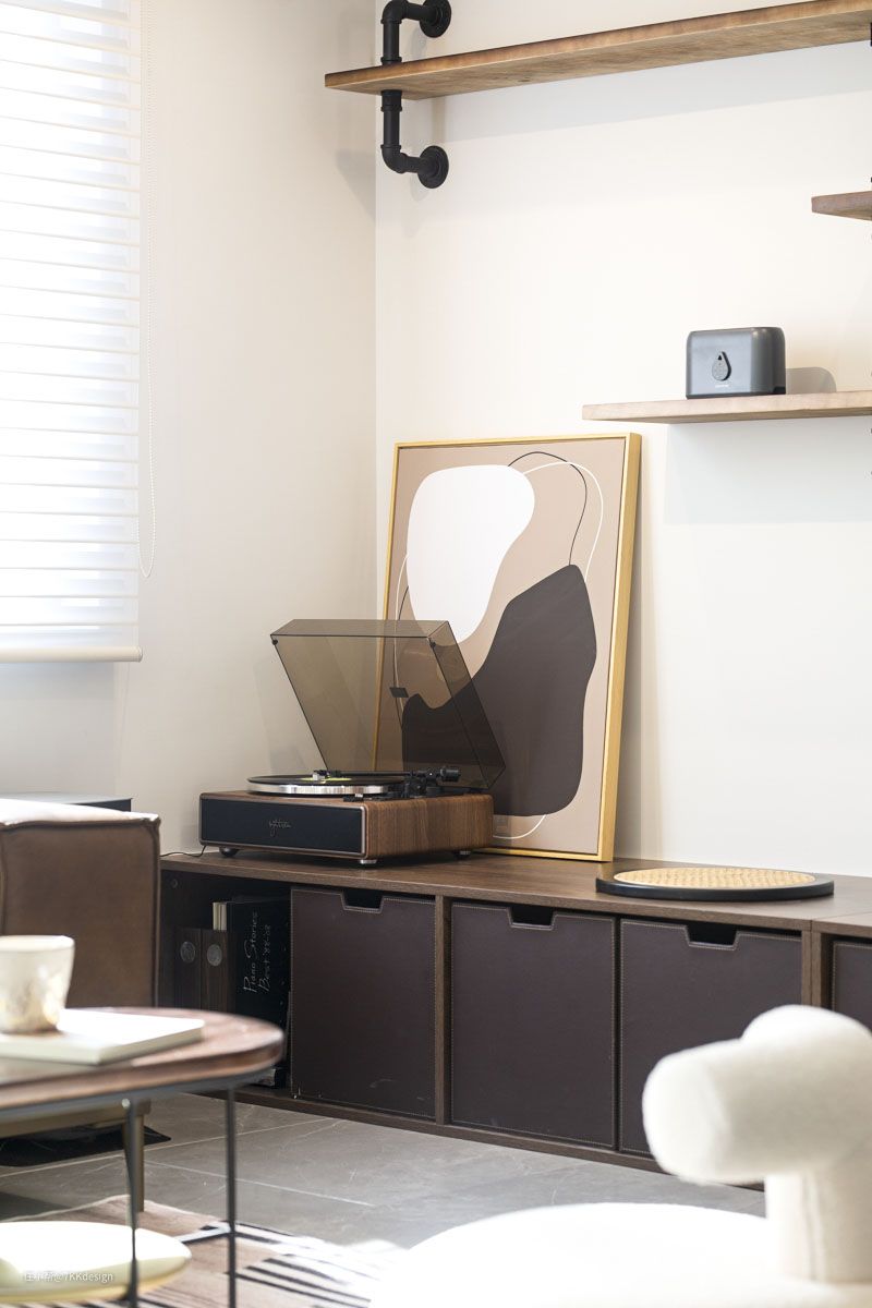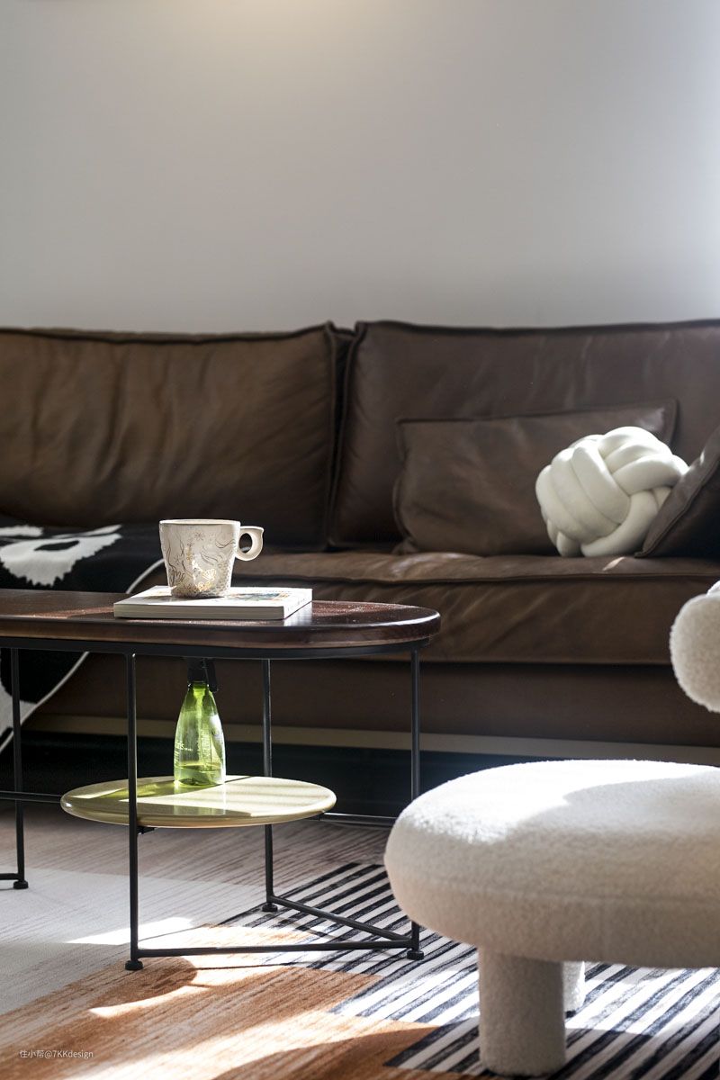 靠次卧这一侧的角落,利用起来,放了一把小型沙发椅,搭配上同款精致小边几,打造休憩一角,也是一个小小的阅读角,一人阅读,一人办公,互不影响,又能交流沟通。