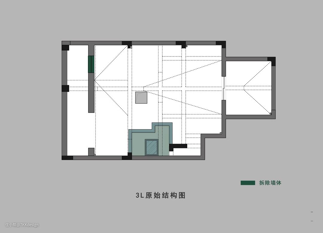 原本结构进门的第一视野,右侧的空间被墙体分割的碎片化,整个视觉感受不是很好,遮挡过多导致南北不是特别通透。我们把室内的非承重隔墙都拆掉了,整个空间看来开阔了很多,视野及采光也得到大程度的提升 。还改变了楼梯形式及走向,并且新砌了长1180mm厚120mm的墙体与一侧齐平,作为楼梯区和玄关区的隔断,使其成为一个方正的区域.