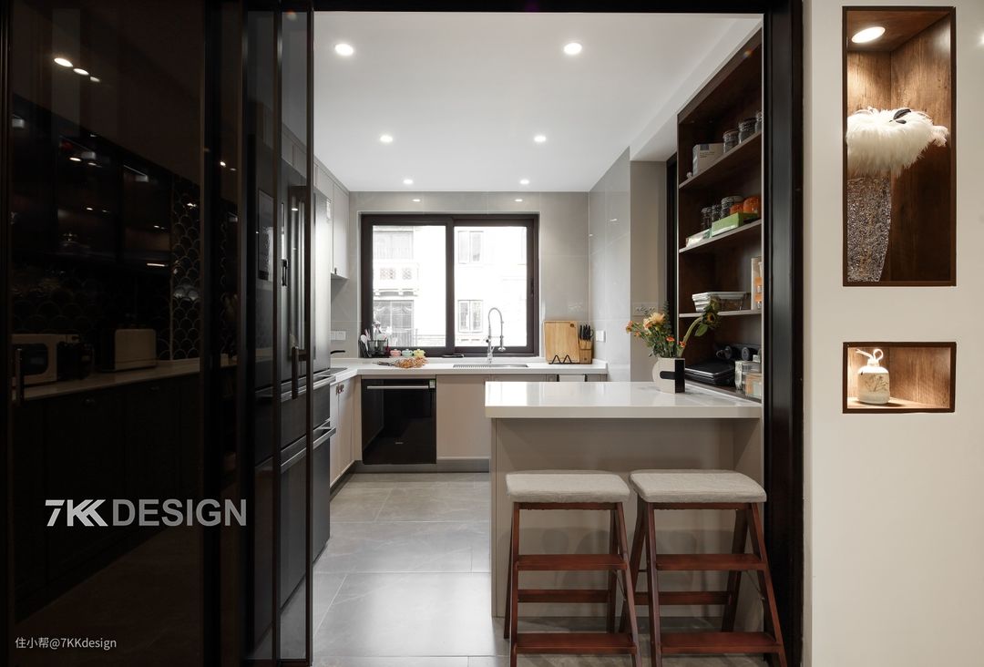 玄关走进来,右侧留了个宽800mm夹道是通往卫生间的。再往里是房主想要的中厨,开门做的是正对开窗的吊轨式黑框三联动折叠玻璃门,开合之间都不会对采光造成影响,厨房与夹道的一侧,还有一道门,双门的设计,完美的实现了可开放的封闭式厨房,不用担心油烟外泄的问题,动线上也更加顺畅。