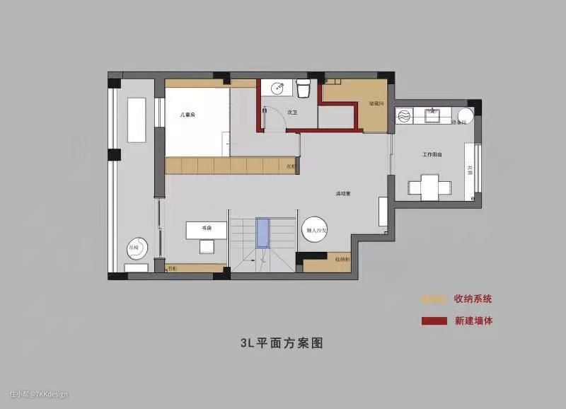 3L平面方案: 考虑到业主想要给孩子一个独立的成长环境,我们对阁楼的定位便是“孩子的小世界”。根据层高差异化及顶面结构的特性,来布局区域属性。采用柜体来代替隔墙及新建墙体的形式,来对空间进行重新分割。在这个空间,我们分区设置了睡眠区,学习区及休闲娱乐区,两个阳台分别为休闲与生活,还增设了一个隐形储物间。 从楼梯上来,考虑到安全问题还需兼顾采光及空间的通透性,我们在两侧选择安装玻璃隔断,能够弱化复杂的顶面结构带来的压抑感,且透光的同时增加视觉上的过渡,也有了一定的私密性。