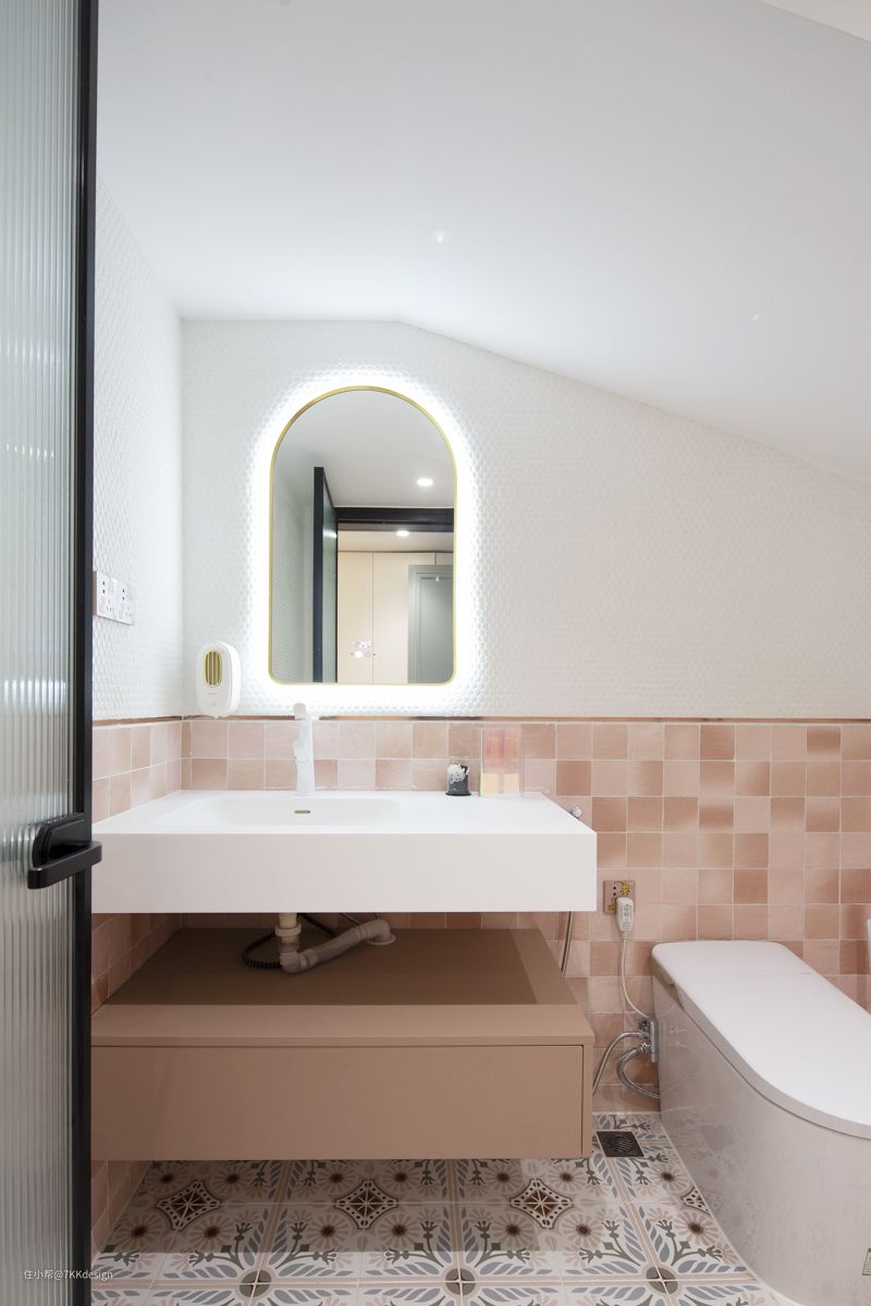 小女孩粉粉嫩嫩的专属卫生间,粉色+白色+黑色+金色,打造卫生间颜值巅峰。 白色防水墙漆与渐变粉你瓷砖铺贴,白色洗手台+金边浴室镜,拼花地砖+黑边玻璃门,给人软萌中透点酷酷的感觉,和屋主的女儿的性格形象有点像。