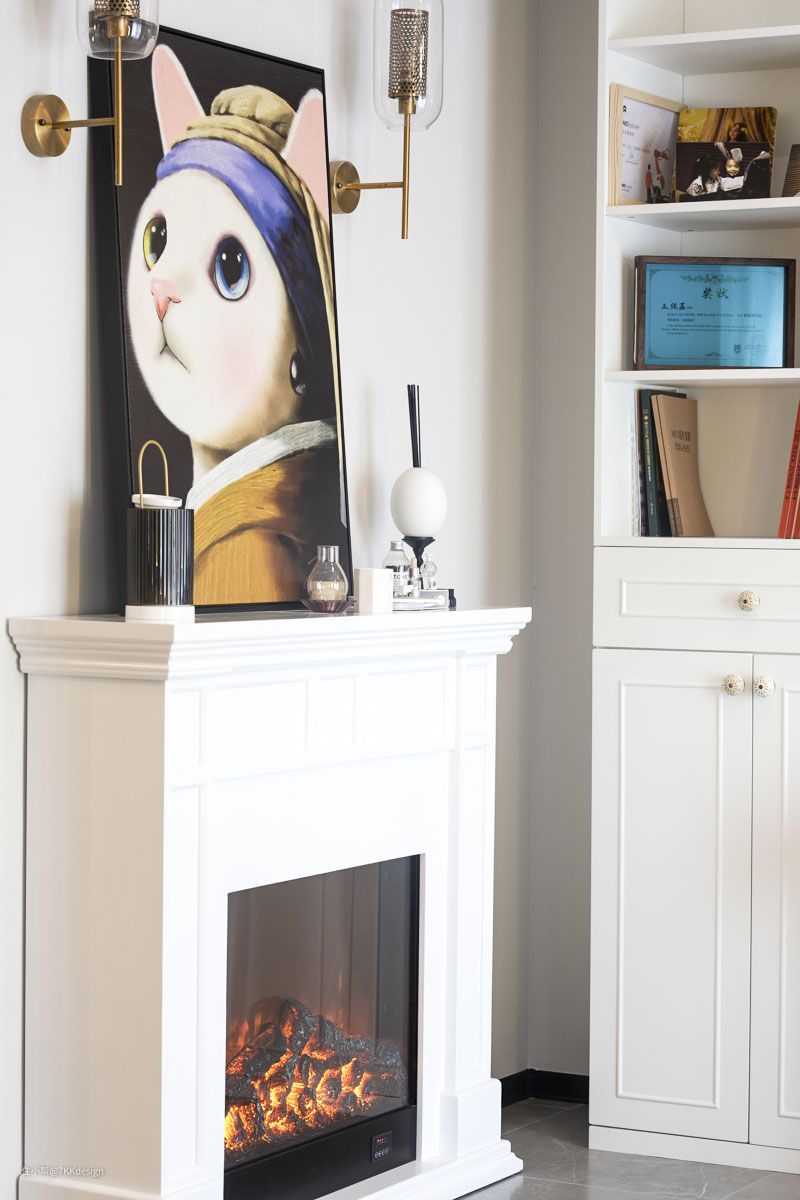 客厅旁的小活动厅的墙面,定制壁炉,上方台面摆上香薰蜡烛及艺术装饰性画,.