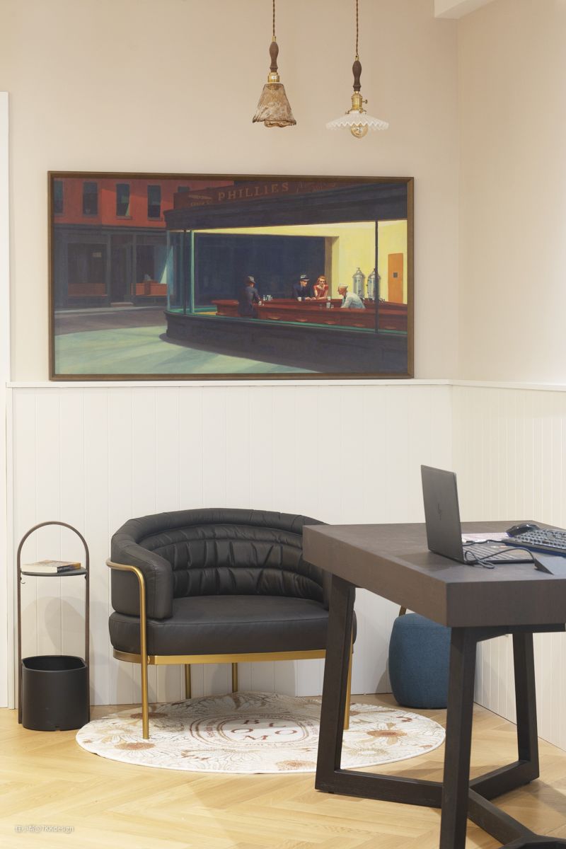 靠楼梯的一侧,充分利用凹区设置了卡座,办公区与楼梯的位置,尽可能的拉到一直线上,形成一个没有磕碰弯绕的走道动线。
