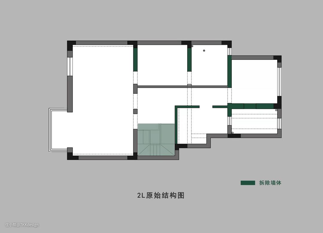 2L户型结构: 二层原结构的整个大框架与一层保持了一致性,配置了主卧大套间,带有衣帽间及独立的卫生间,另外还有两个小房间,靠楼梯的房间,只能靠小窗借光,关上门太像一个“小黑屋”,而且还有个凸出来的“大阳角”,没有充足的自然光线的空间会显得过于压抑。