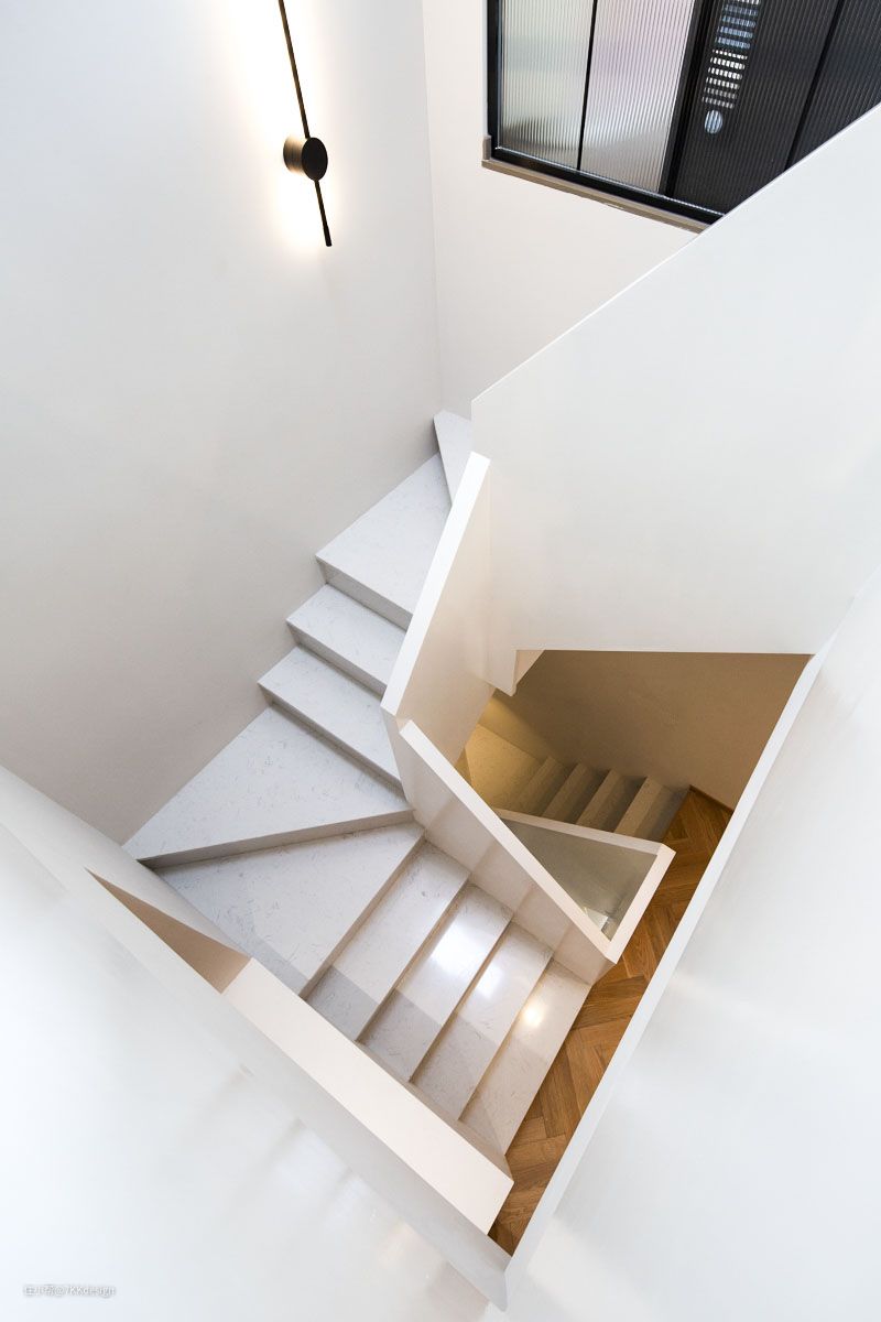 白色楼梯设计,线条的交错,动线分明;色彩的纯粹感,视觉上清爽舒适;悬挂黑色的线条构造壁灯,为走道照明的同时,又点缀了空间。大理石踏步,扶手是木质的上的白色漆面。