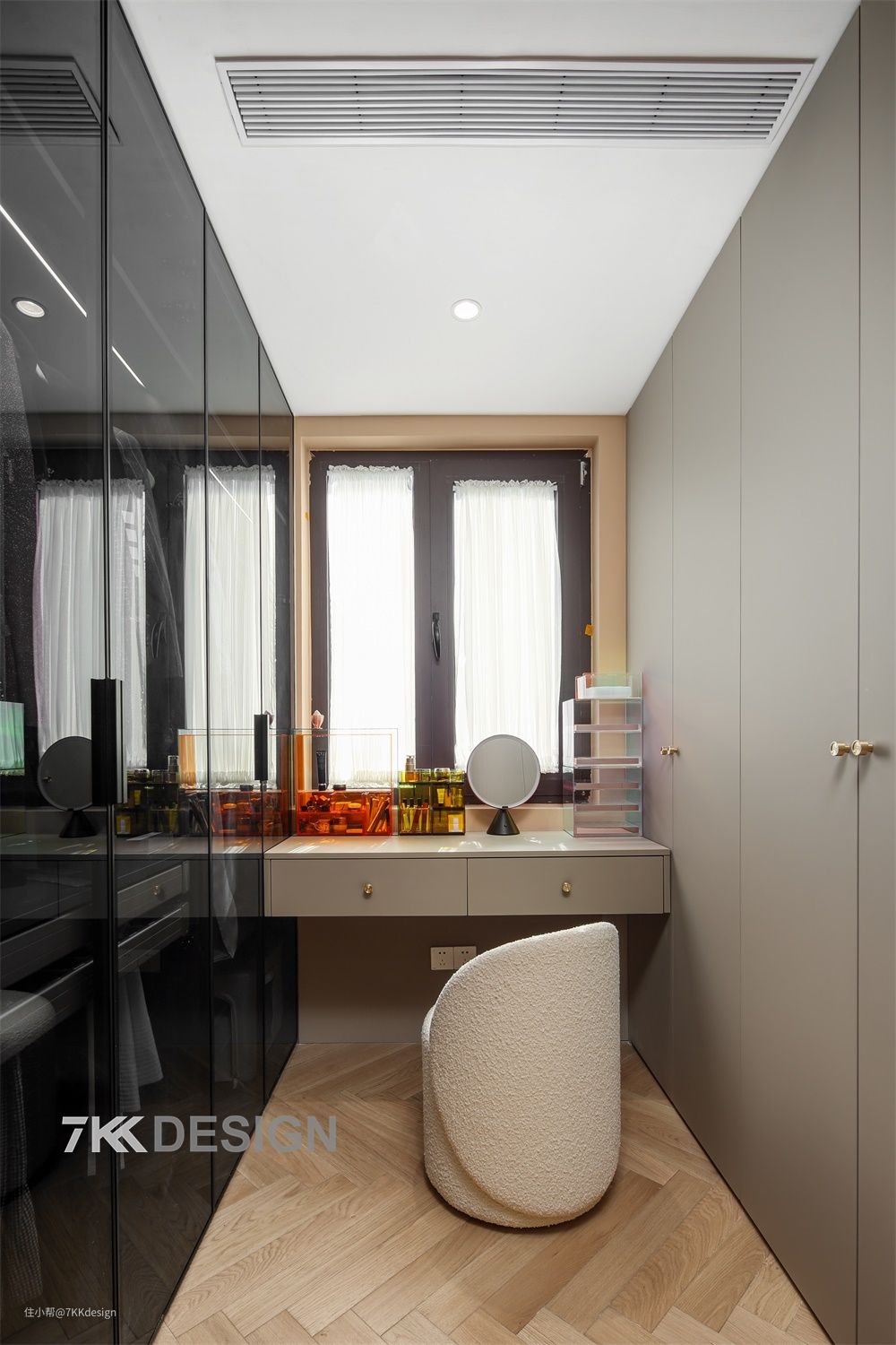 主卧超大衣帽间,给到的面积有近14㎡,长条形的方正空间,从窗台到卫生间门长达5.7m多,在两侧设置了满满当当的衣柜空间,1.2m宽的过道,两个人来回走动,活动起来顺畅,不拥挤。利用靠窗的位置为女主人增设了一个梳妆台,起床洗漱换衣梳妆形成流利的动线。 一侧是可视化的衣柜,一侧是隐藏式衣柜,组合使用,比如日常衣服放可视化衣柜,找起来方便,过季衣物放隐藏式衣柜,实用美观。