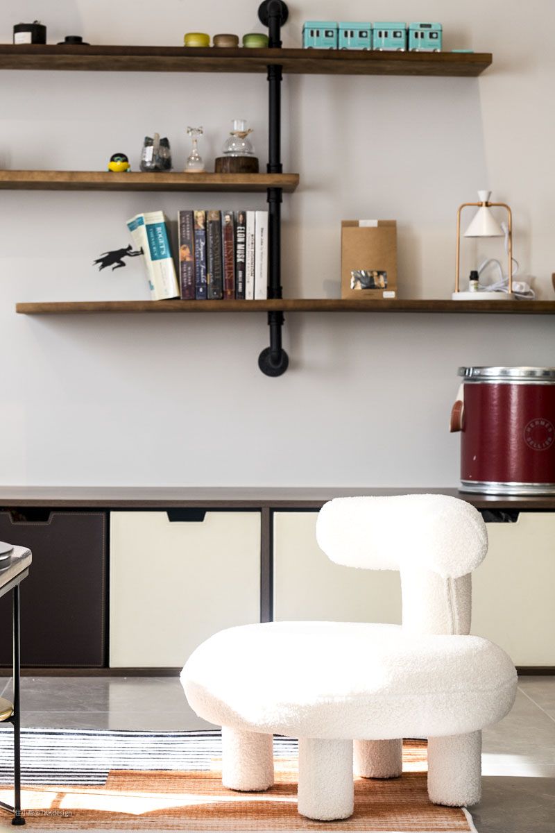 沙发区,女主人在网上淘了一个可拆洗的羊羔绒儿童沙发凳,羊羔照射进来的时候,看起来软绵又舒适。侧边还配了一把沙发躺椅,沙发区,可坐可躺,怎么舒适怎么来。 沿着墙面的的空间,设置了开放架及地柜,上面可以展示游玩搜罗的纪念品,下方可储物,收纳零食杂物等。
