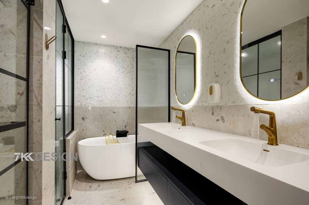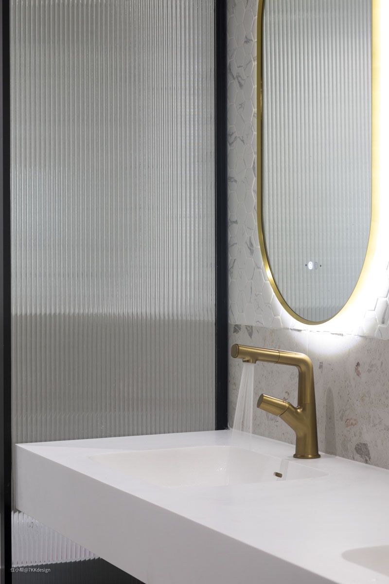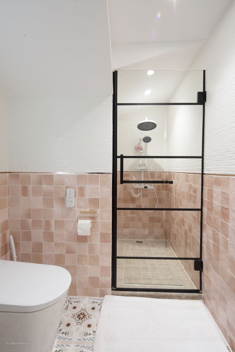 小女孩粉粉嫩嫩的专属卫生间,粉色+白色+黑色+金色,打造卫生间颜值巅峰。 白色防水墙漆与渐变粉你瓷砖铺贴,白色洗手台+金边浴室镜,拼花地砖+黑边玻璃门,给人软萌中透点酷酷的感觉,和屋主的女儿的性格形象有点像。