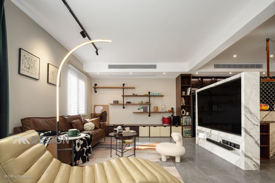 ✅LDK设计:开放式空间,全部打开连通,通透显大,在家办party都不是问题。 餐厅看向客厅方向,餐桌+岛台+电视背景墙,在客厅他与餐厅之间做了个半墙的隔断,分割两个功能区,也是连通两个区域的枢纽。餐厅吊灯用的皮带做悬挂,定制的,个性有特点。餐椅是同样皮质的,上下呼应,特别和谐。在岛台的和餐桌衔接的侧面,还装了个轨道插座备用,冬天吃火锅方便多了。