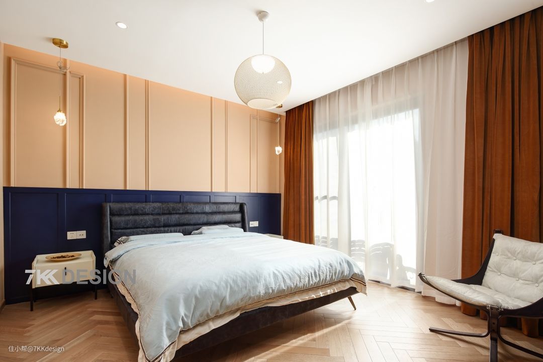 床头背景墙本来设计是用的浅咖色,后面选的暖咖色与宝蓝色拼接,效果也不错,温柔与沉静的结合,墙面用石膏线条做造型,性价比高,又不失质感。