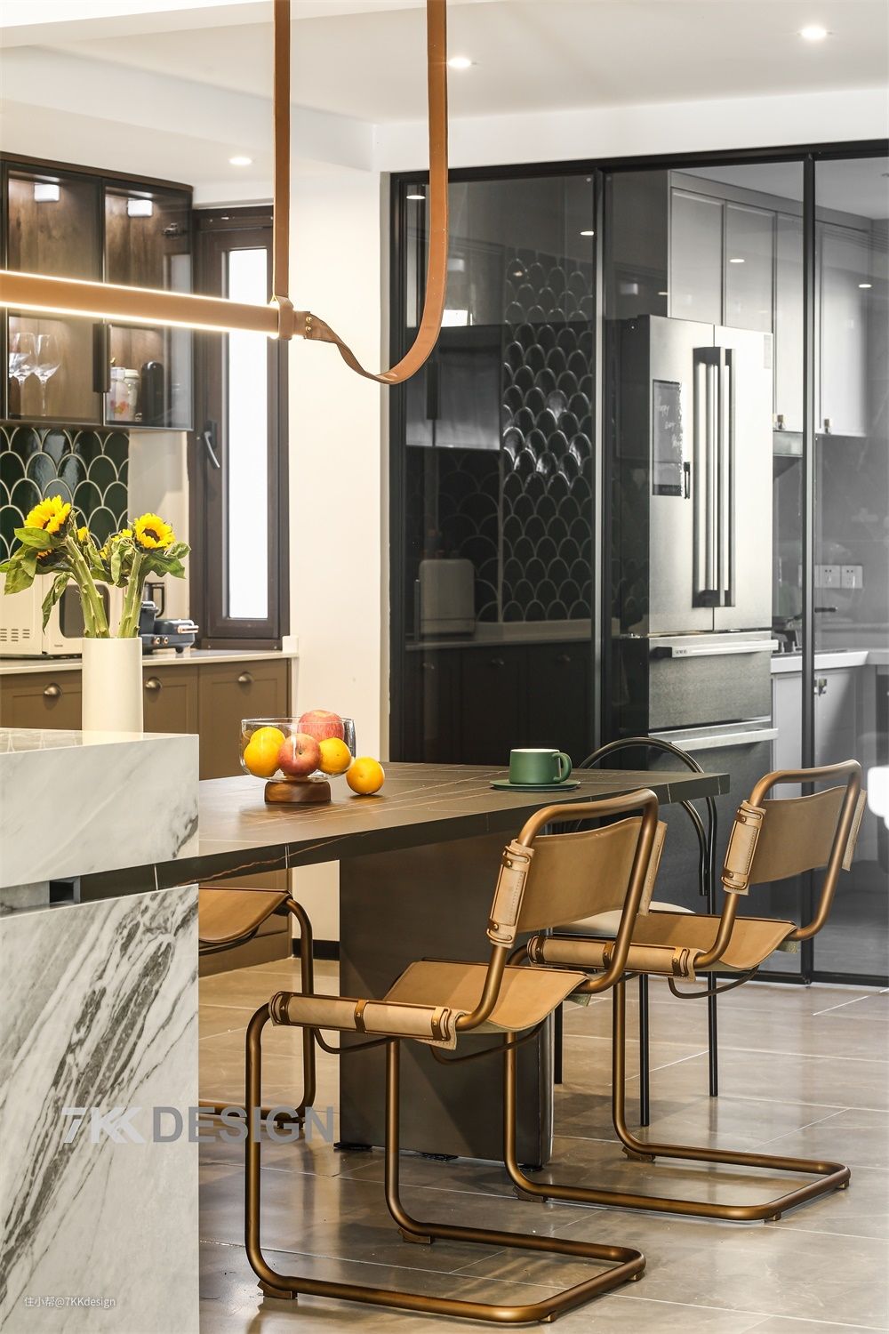玄关走进来,右侧留了个宽800mm夹道是通往卫生间的。再往里是房主想要的中厨,开门做的是正对开窗的吊轨式黑框三联动折叠玻璃门,开合之间都不会对采光造成影响,厨房与夹道的一侧,还有一道门,双门的设计,完美的实现了可开放的封闭式厨房,不用担心油烟外泄的问题,动线上也更加顺畅。