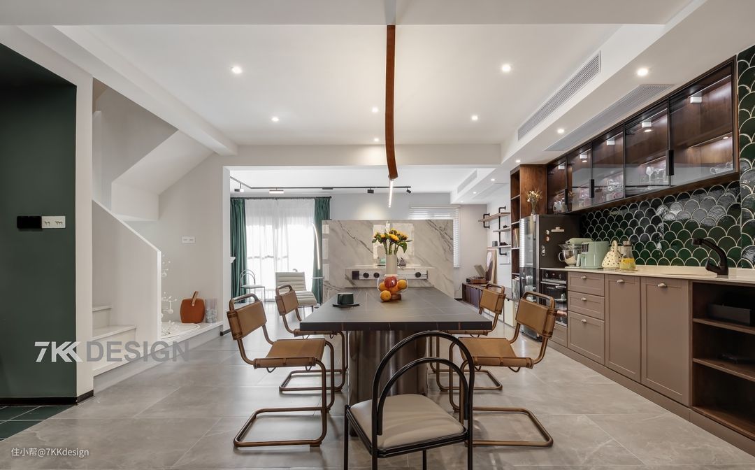 ✅餐桌岛台一体化设计:餐桌与岛台摆放在一起,两者形成一体化,在功能上互借,美观流畅且实用。 1L整个是活动区,餐厅的进深,从餐边柜到楼梯有4m,空间的尺度比较大,我们以餐桌+岛台一体化作为公区的一大中心,玄关、客餐厨、卫生间布局呈洄游动线。 厨房到客厅的墙面,整面墙结合长条形操作台及收纳柜,打造了强大收纳空间,及操作台,柜体采用上吊柜下地柜中空设计,视觉感横向延伸,足有5m多。作为餐边柜及西厨使用。
