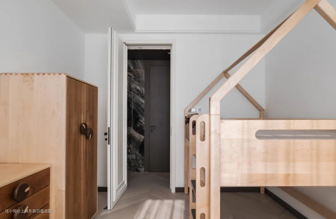 儿童房门的设计也非常用心,使用与墙面一致的装饰造型,在外人看来完全看不出是一道门,既能够满足孩子对于不同空间的探索,也能够保证很好的保护孩子的私密性,让他沉浸在自己的小小世界中。