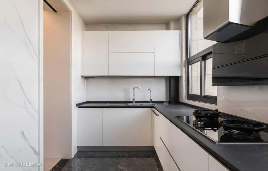 厨房使用了U型布局,质感的黑色哑光操作台,干净利落的白色柜体,让整个空间都凸显出利落整洁的视觉感受。白色双层烤漆橱柜保证强大的储物功能,墙面使用白色大理石瓷砖通铺,兼具美观与实用性。