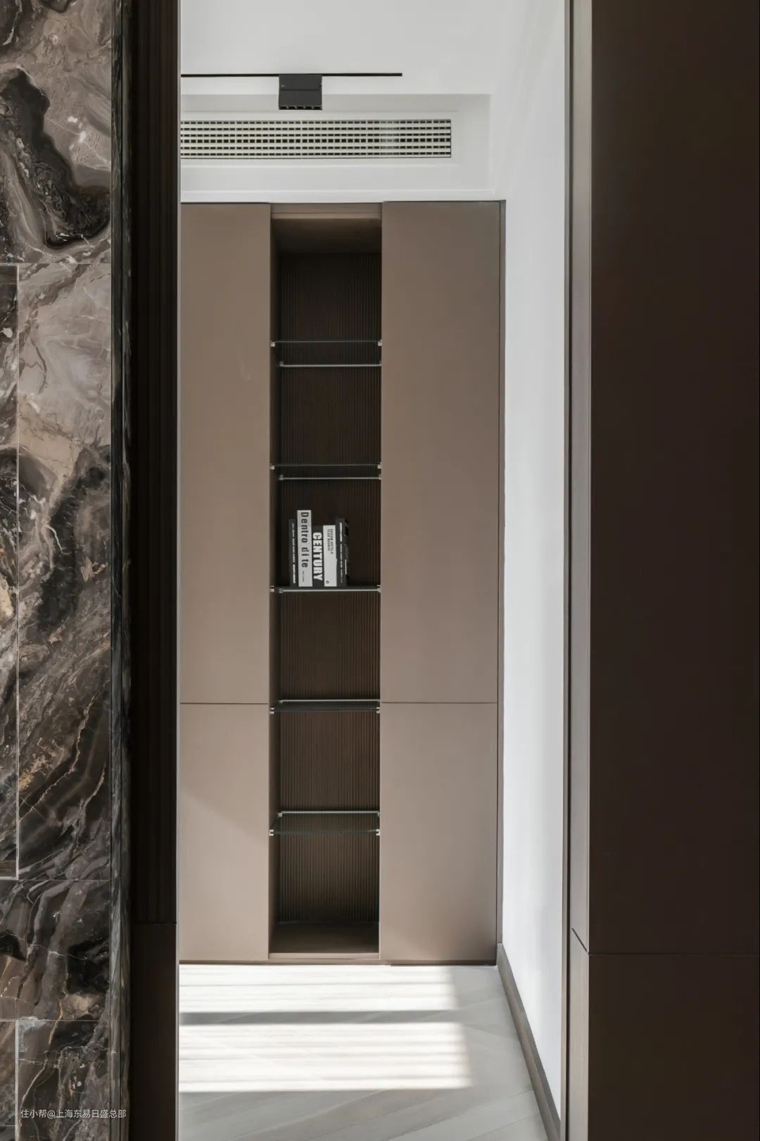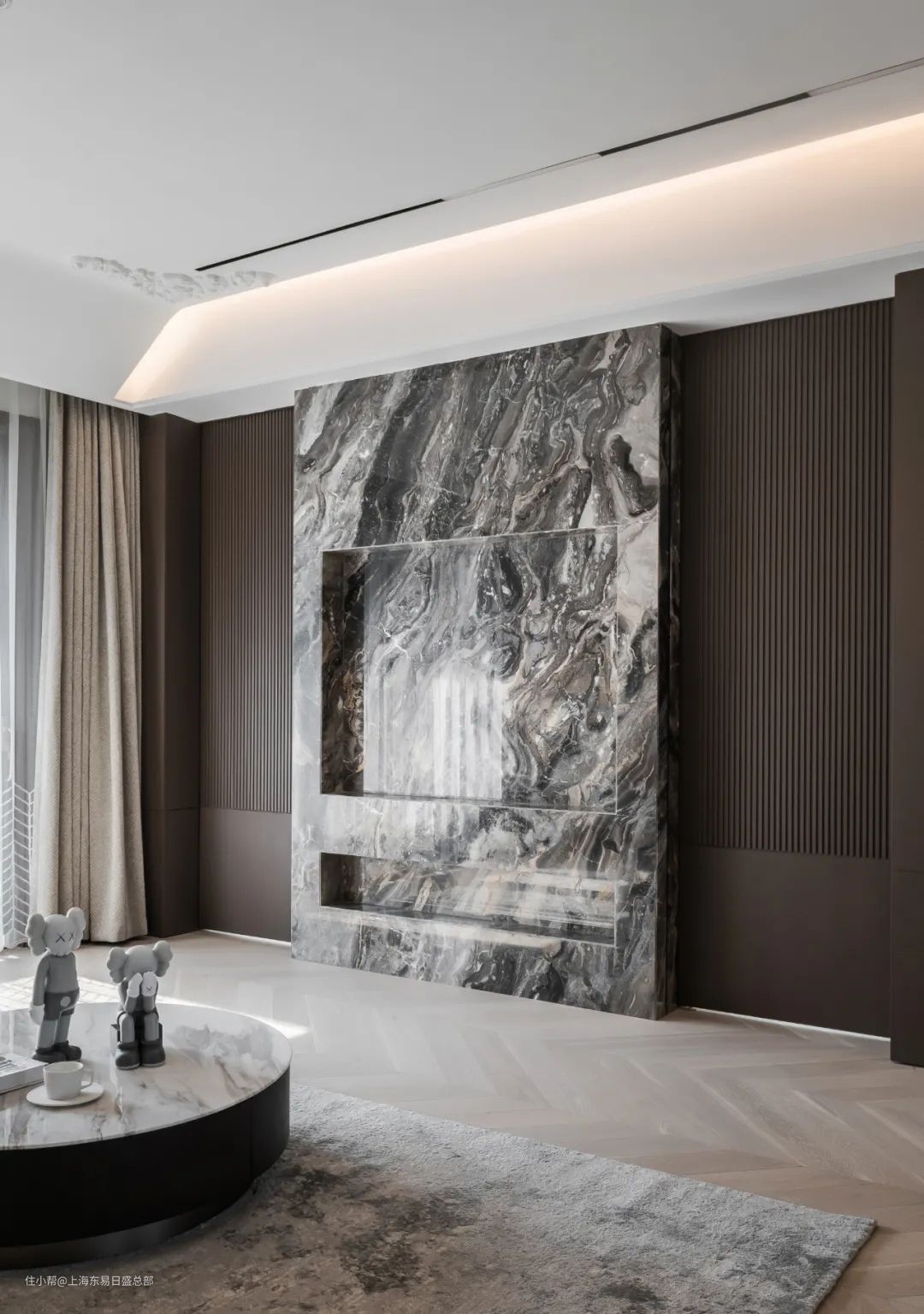 电视背景墙做了对称设计,中间的大理石墙面内部添加了钢结构,中间留空用于隐藏推拉门。两侧木质移门拉开后,完全看不出后面有着隐藏的卧室。父母偶尔来居住时,就可以完全作为封闭式卧室使用。