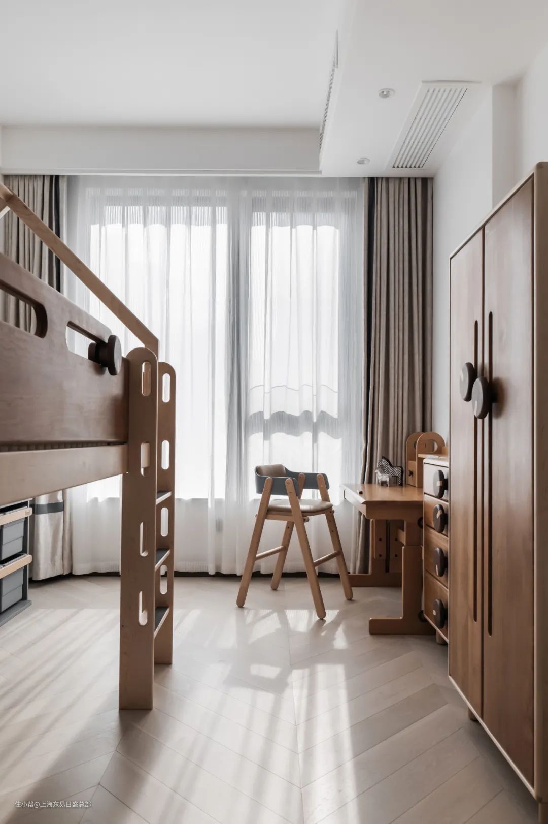 考虑到小孩子在这个年纪非常好动,所以儿童房的家具大都选用了温润的成品木质家具,边角都做了圆弧处理,让孩子在舒适玩耍中也能被小心保护。儿童床的设计十分有趣,通过长层做睡眠区域,下层可以做专属的玩耍区域。