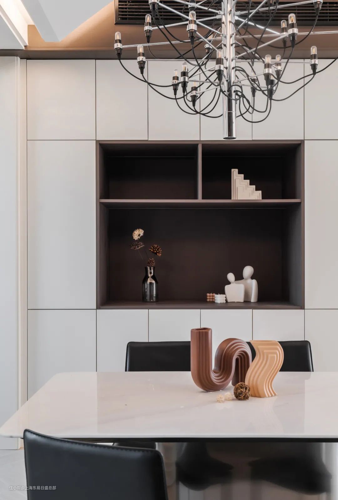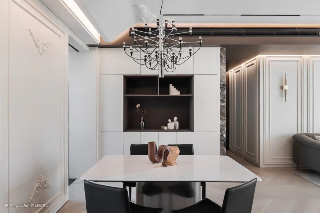 白色的餐边柜设计也非常利落简洁,中间掏空做开放式布局,棕色调的内饰面在白色的空间中,更显大气利落,放置女主人喜欢的小摆件。清新的花束,精美的FLOS吊灯雅致细腻,让每一餐都能感受到满满温馨感。