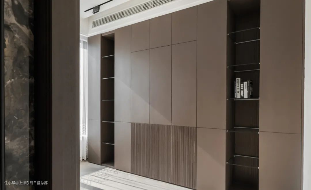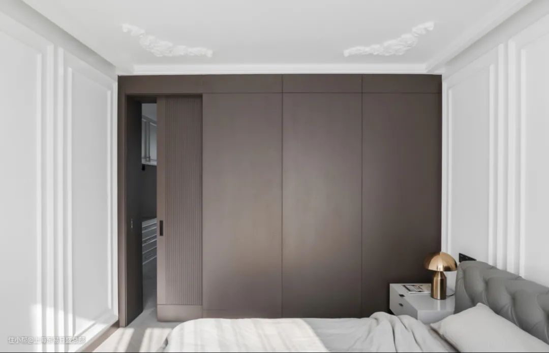 主卧门和橱柜都使用了棕色调的板材,吊柜门的设计既保证不会形成多余的噪音,同时也避免卫生清洁的繁琐。通顶橱柜做无把手设计,干净利落,舒适静谧的色调组合以及布局上的简约,打造了整体舒适无压的睡眠空间。